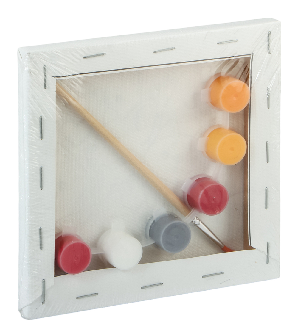 В комплект входят холст на подрамнике, акриловые краски, кисть.