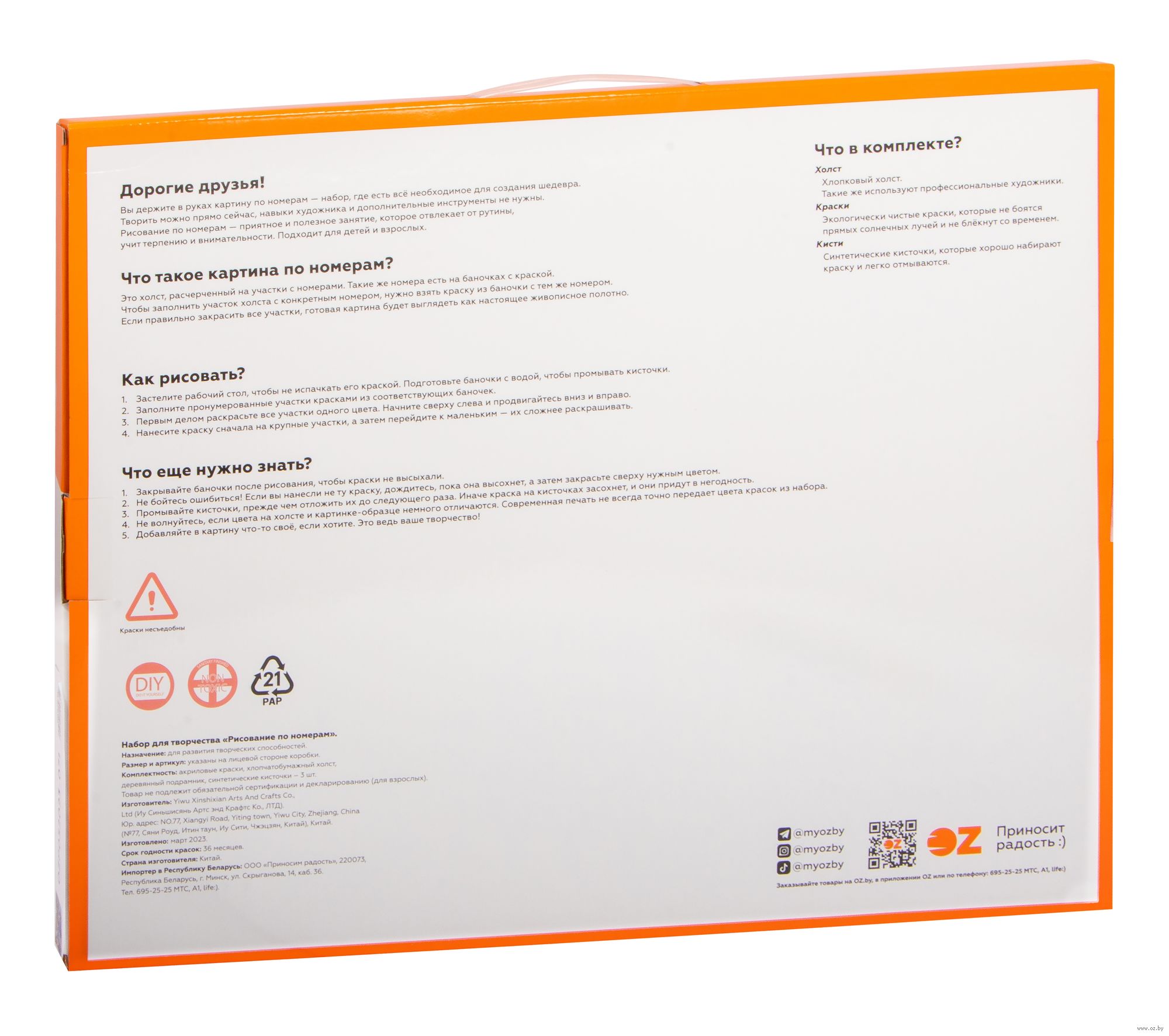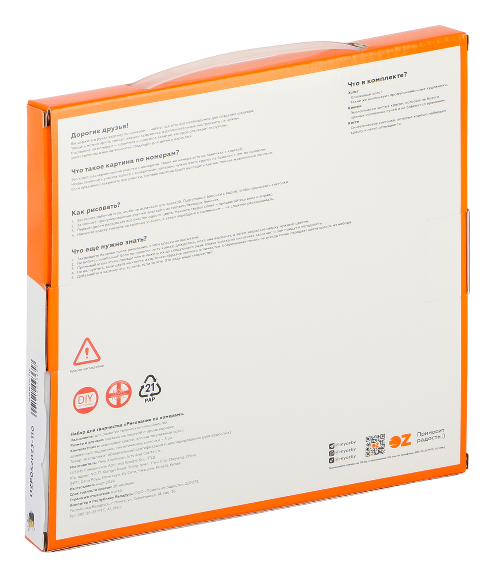 В набор входит холст с черно-белой цифровой разметкой. Каждой краске в наборе соответствует свой номер. Необходимо просто аккуратно нанести краски на участки с соответствующими цифрами. И так постепенно будет проявляться будущий шедевр.