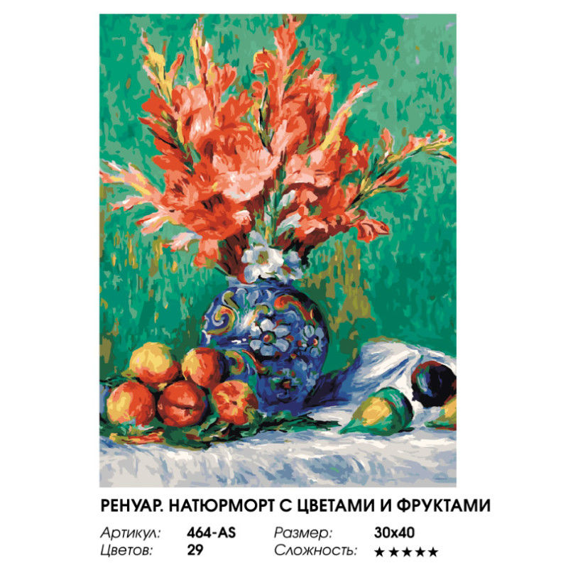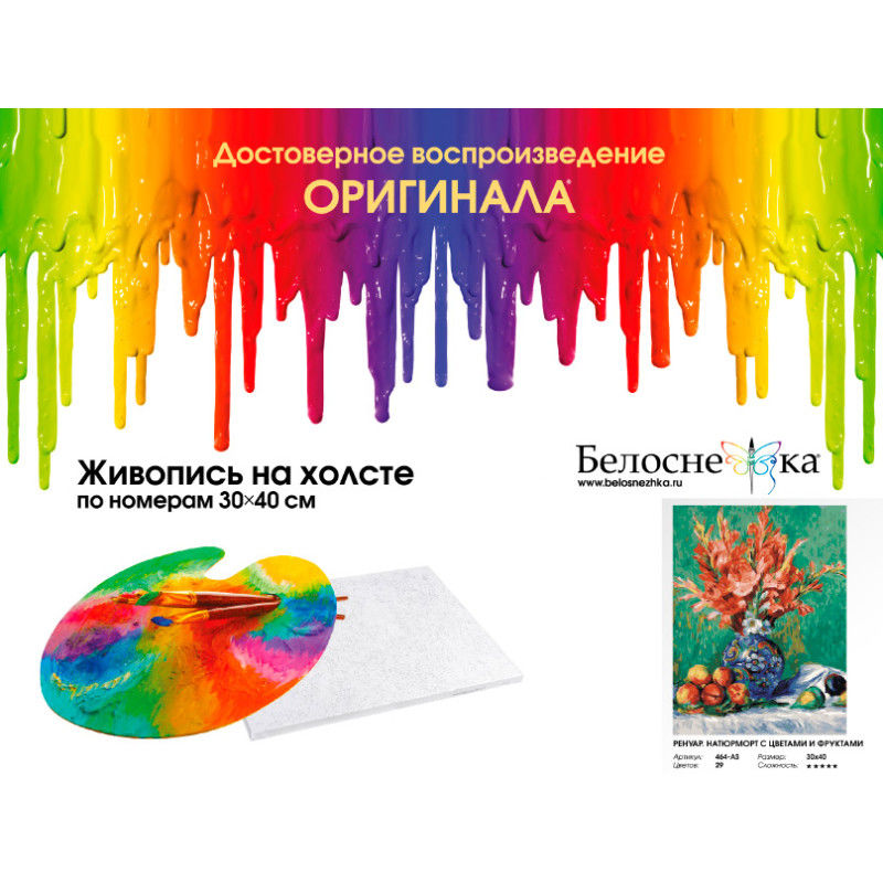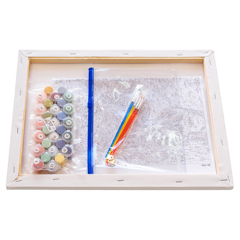 Основа картины – хлопковый холст на деревянном подрамнике с напечатанной схемой изображения. Холст загрунтован и полностью готов к нанесению краски, акриловые краски на водной основе экологически безопасны, номера на баночках соответствуют номерам на схеме. Количество красок достаточное для раскрашивания картины, даже в 2 слоя.