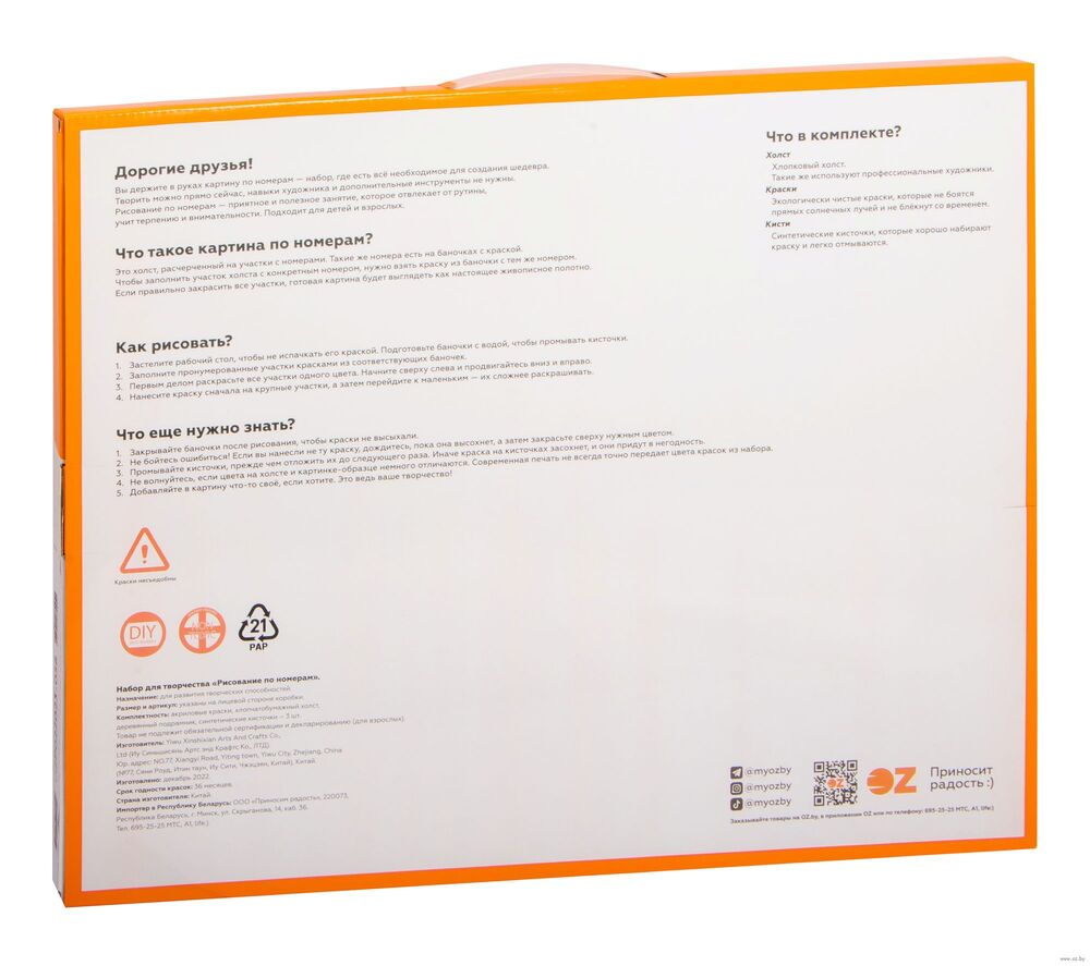 В набор входит холст с черно-белой цифровой разметкой. Каждой краске в наборе соответствует свой номер. Необходимо просто аккуратно нанести краски на участки с соответствующими цифрами. И так постепенно будет проявляться будущий шедевр.