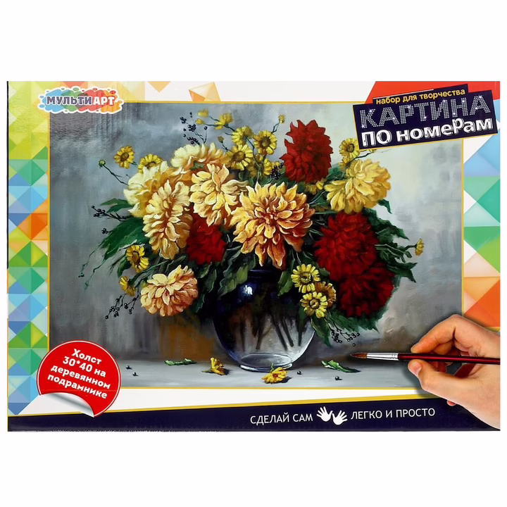 В набор входит холст с черно-белой цифровой разметкой. Каждой краске в наборе соответствует свой номер. Необходимо просто аккуратно нанести краски на участки с соответствующими цифрами. И так постепенно будет проявляться будущий шедевр.