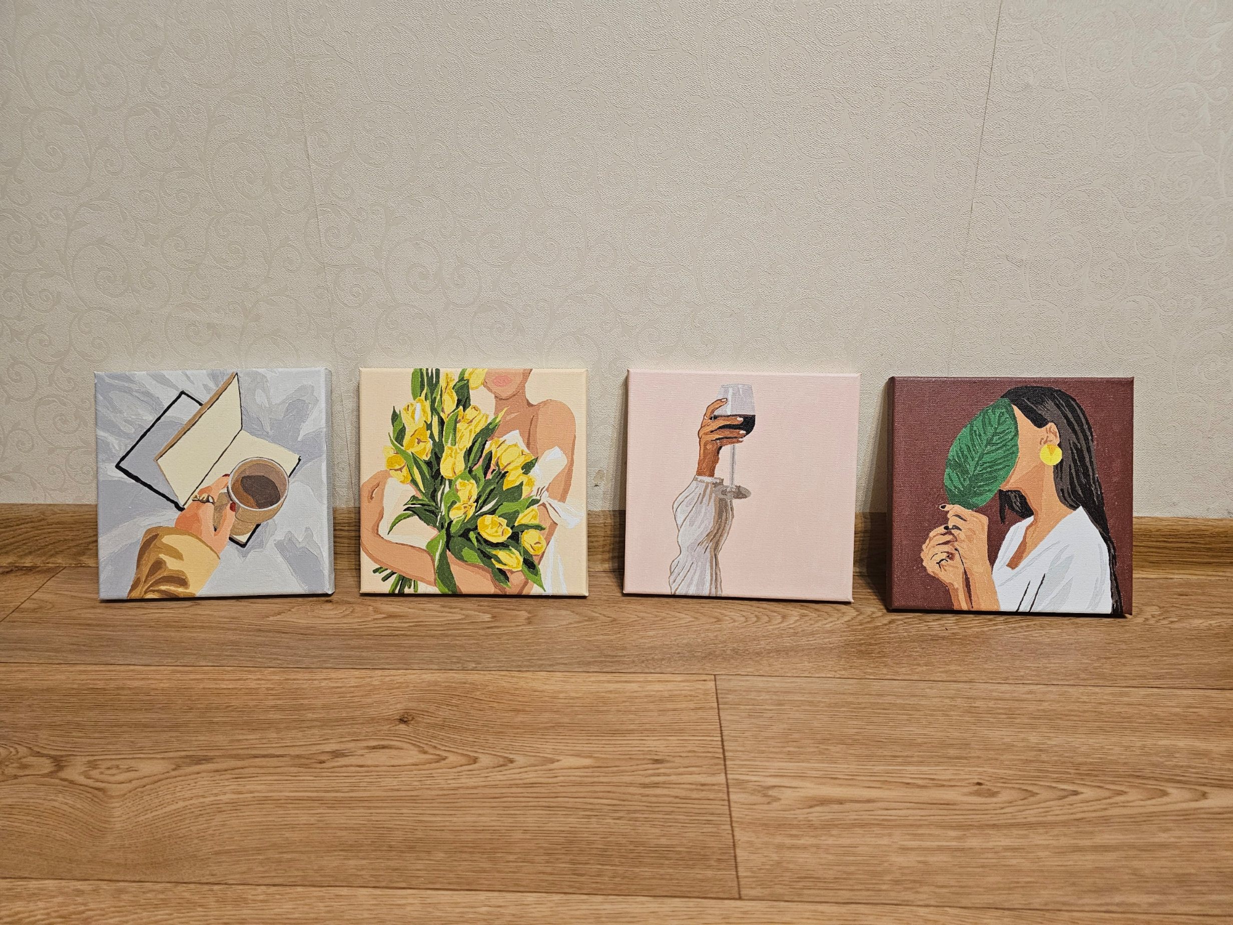 Рисовала картину для того, чтобы повесить в комплекте с другими картинами из этой серии. Этой ставлю 5 из 5. Цвета соответствуют изображению на сайте. Краски не сухие. Кисточки в комплекте. Эту нарисовала меньше, чем за час. Рекомендую!