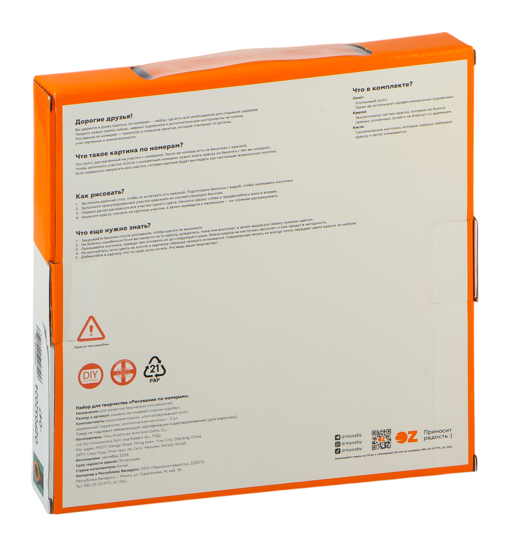 В набор входит холст с черно-белой цифровой разметкой. Каждой краске в наборе соответствует свой номер. Необходимо просто аккуратно нанести краски на участки с соответствующими цифрами. И так постепенно будет проявляться будущий шедевр.
