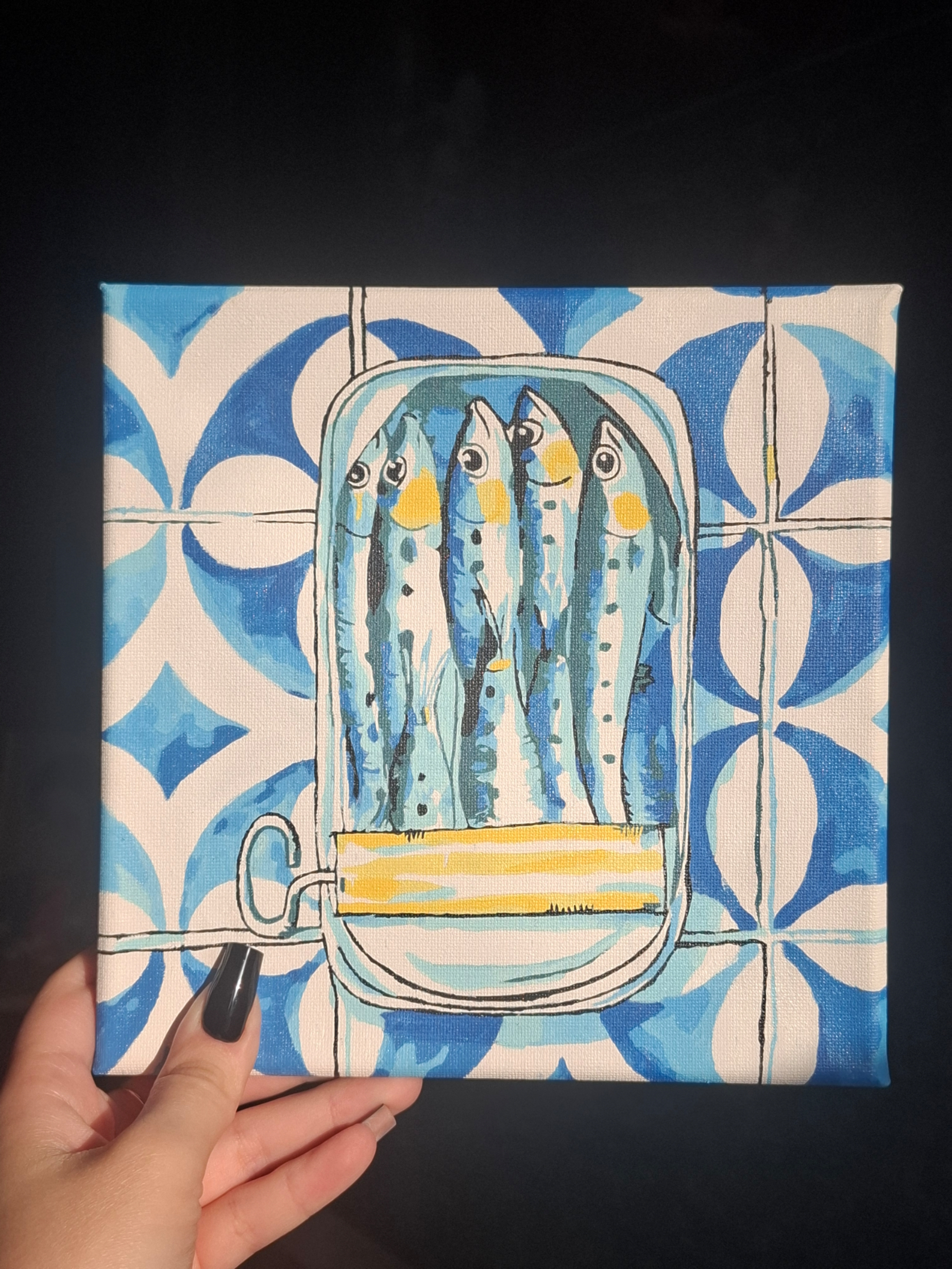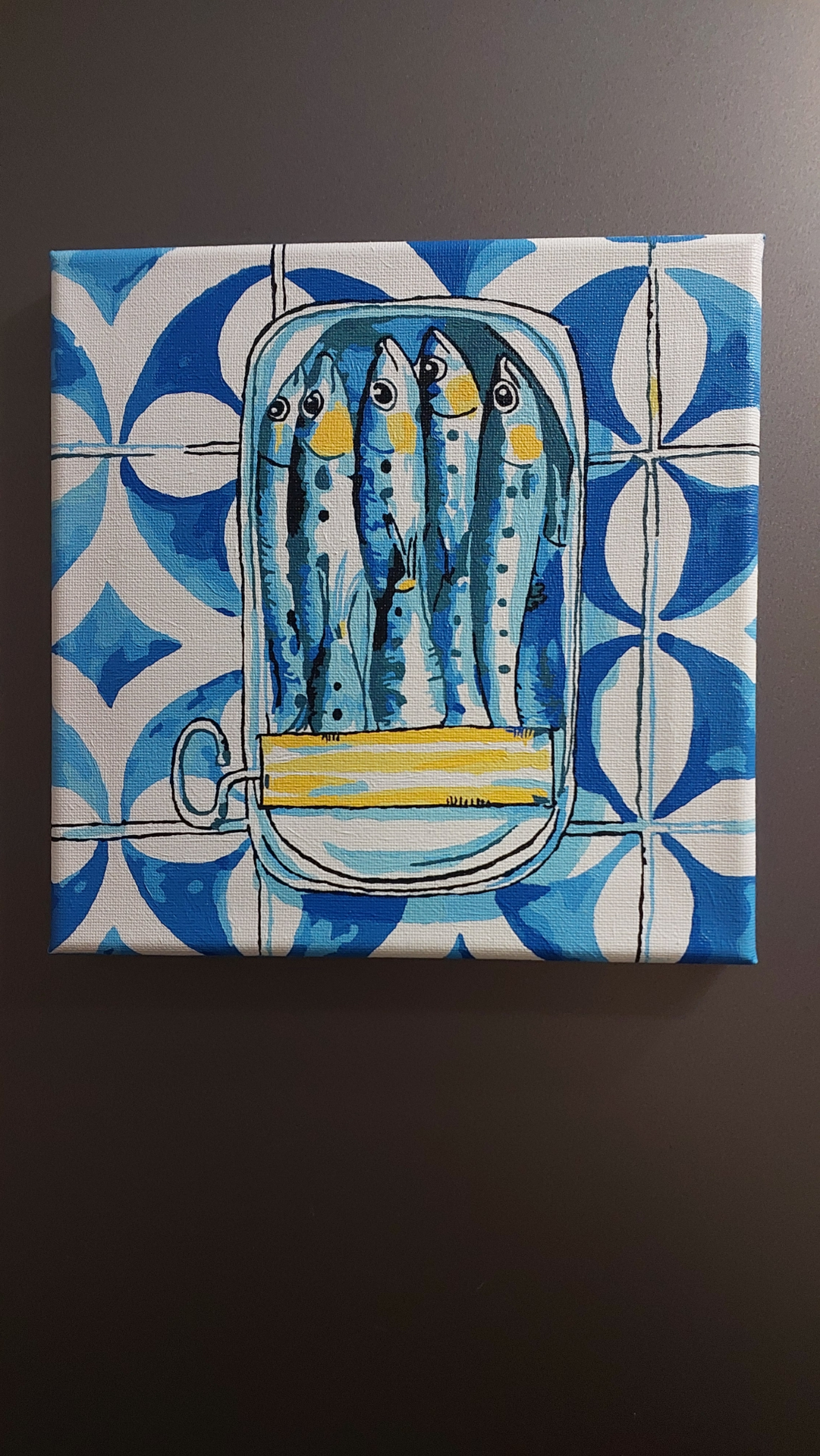 Какие замечательные сардинки! Не могу глаз оторвать! Краски свежие, холст хорошо натянут, кисти удобные. Полюбился этот формат картин: пара вечеров под сериальчик и шедевр готов)
