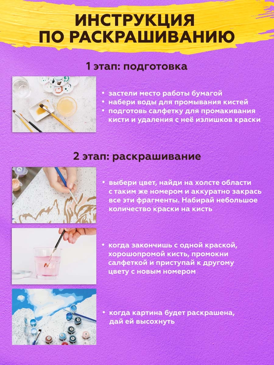 В набор входит холст с черно-белой цифровой разметкой. Каждой краске в наборе соответствует свой номер. Необходимо просто аккуратно нанести краски на участки с соответствующими цифрами. И так постепенно будет проявляться будущий шедевр.
