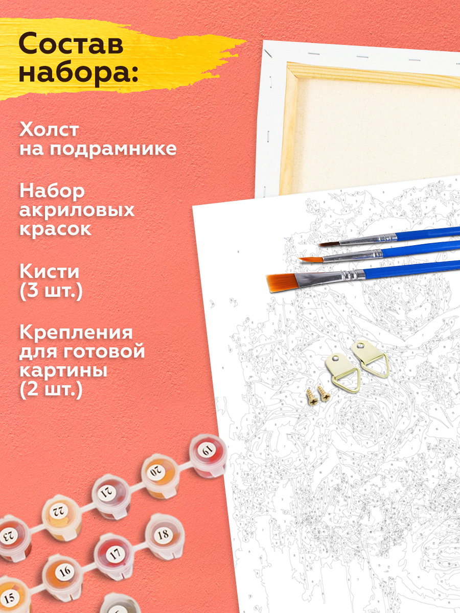 В набор входит холст с черно-белой цифровой разметкой. Каждой краске в наборе соответствует свой номер. Необходимо просто аккуратно нанести краски на участки с соответствующими цифрами. И так постепенно будет проявляться будущий шедевр.