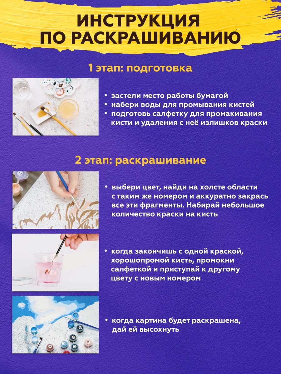 В набор входит холст с черно-белой цифровой разметкой. Каждой краске в наборе соответствует свой номер. Необходимо просто аккуратно нанести краски на участки с соответствующими цифрами. И так постепенно будет проявляться будущий шедевр.