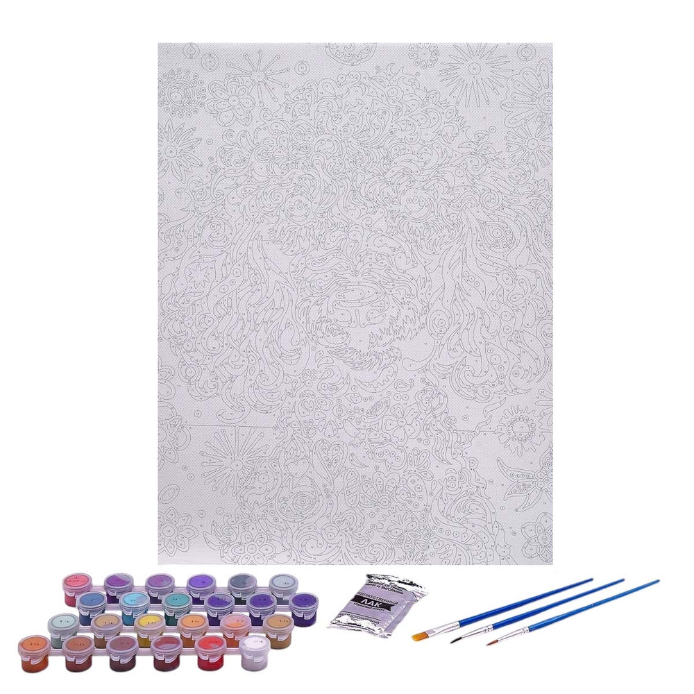 Акриловые краски в баночках с номерами, грунтованный холст на подрамнике, кисти с нейлоновой щетиной (3 шт.), финишный лак, QR-код контрольного листа.