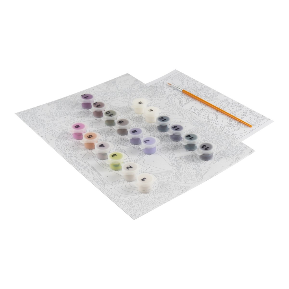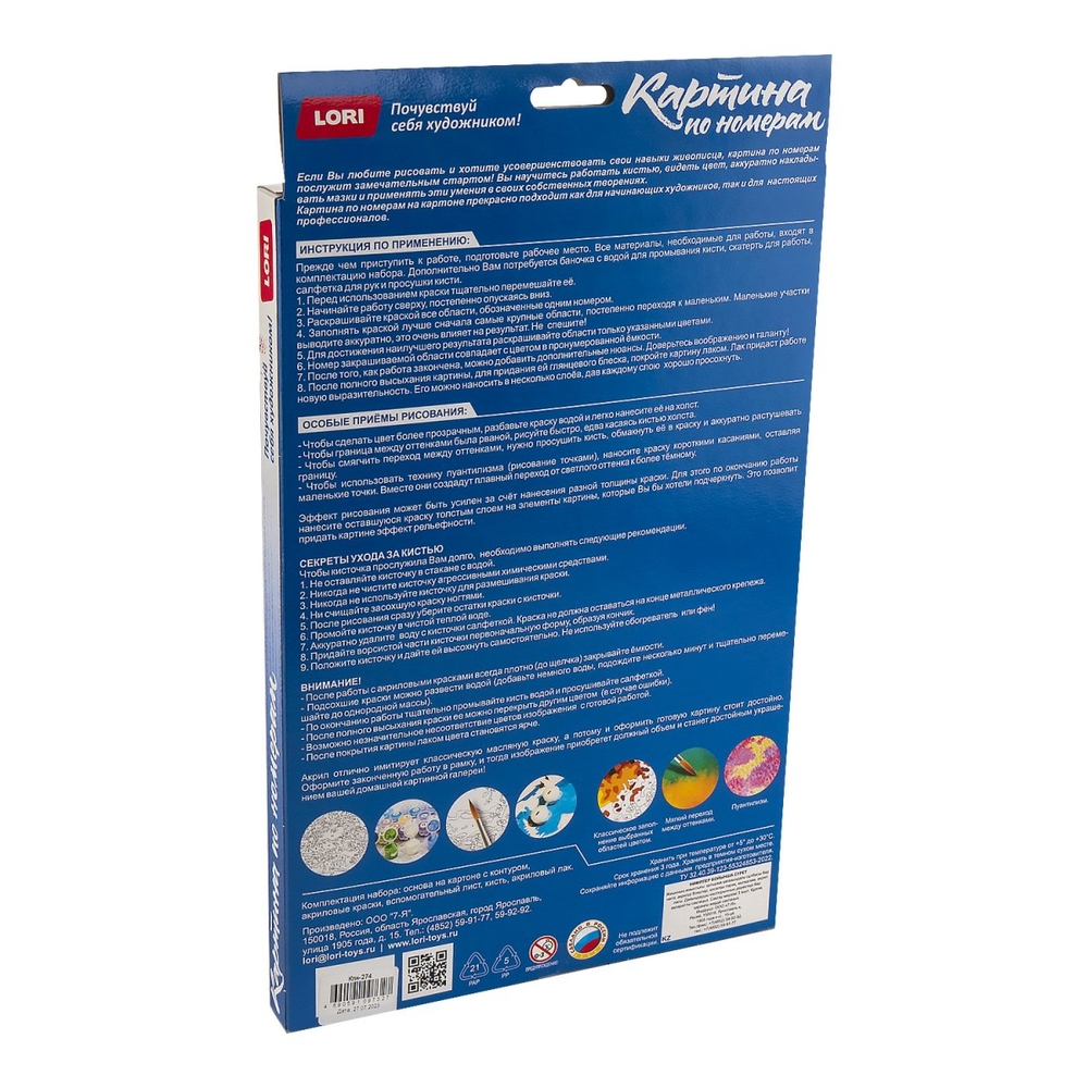 В набор входит основа на картоне с контуром изображения, акриловые краски, кисть, вспомогательный лист и акриловый лак.