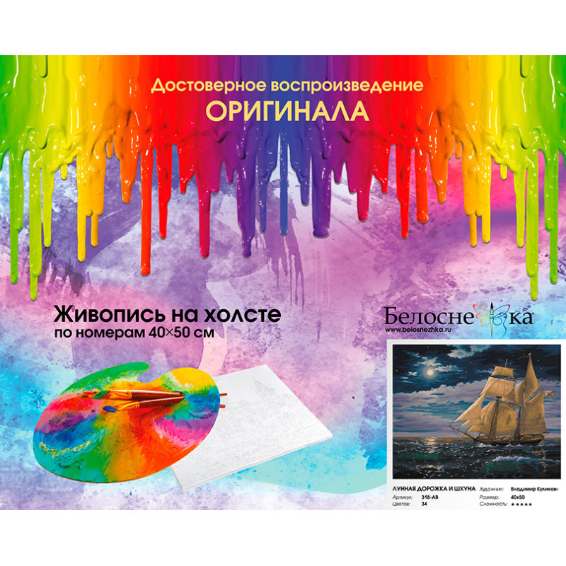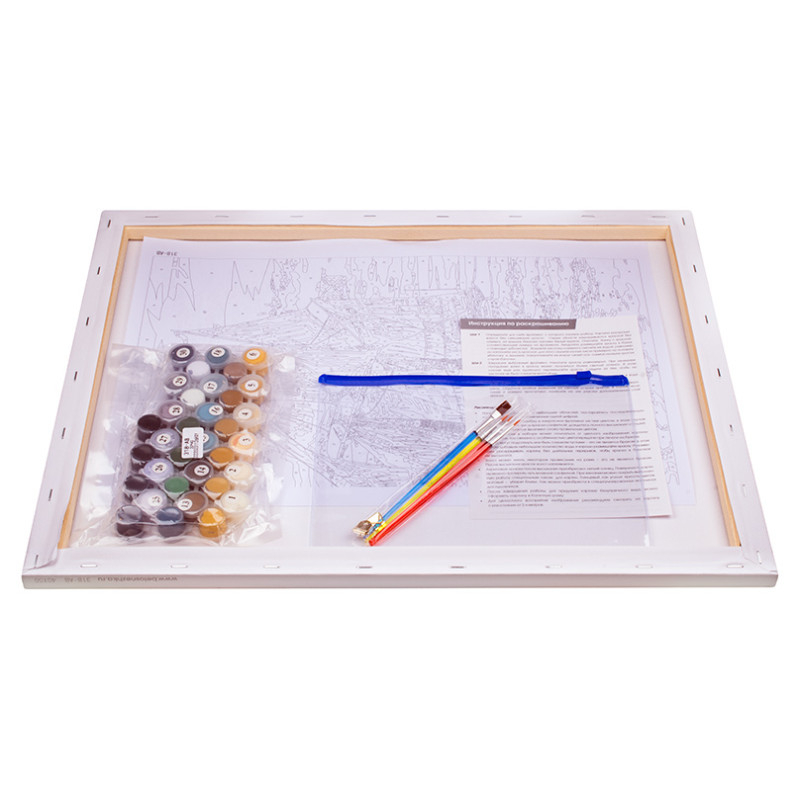 Основа картины – хлопковый холст на деревянном подрамнике с напечатанной схемой изображения. Холст загрунтован и полностью готов к нанесению краски, акриловые краски на водной основе экологически безопасны, номера на баночках соответствуют номерам на схеме. Количество красок достаточное для раскрашивания картины, даже в 2 слоя.