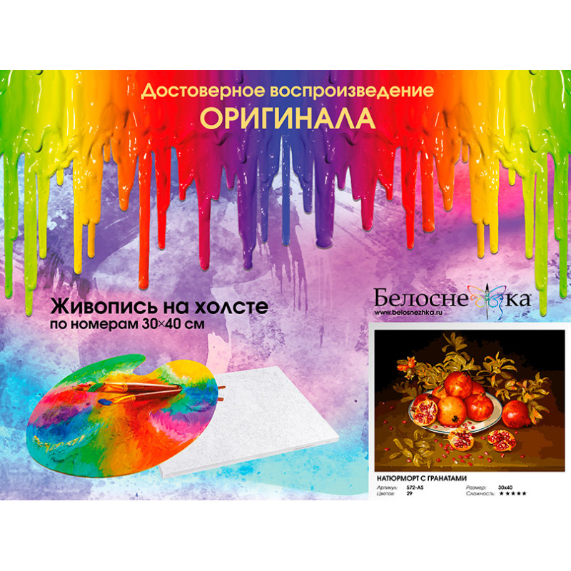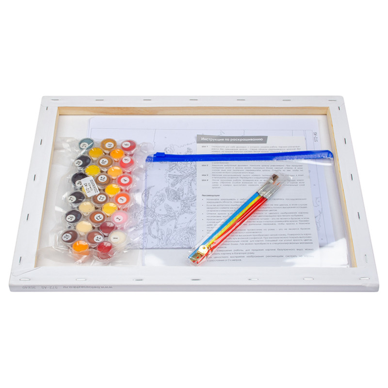 Основа картины – хлопковый холст на деревянном подрамнике с напечатанной схемой изображения. Холст загрунтован и полностью готов к нанесению краски, акриловые краски на водной основе экологически безопасны, номера на баночках соответствуют номерам на схеме. Количество красок достаточное для раскрашивания картины, даже в 2 слоя.