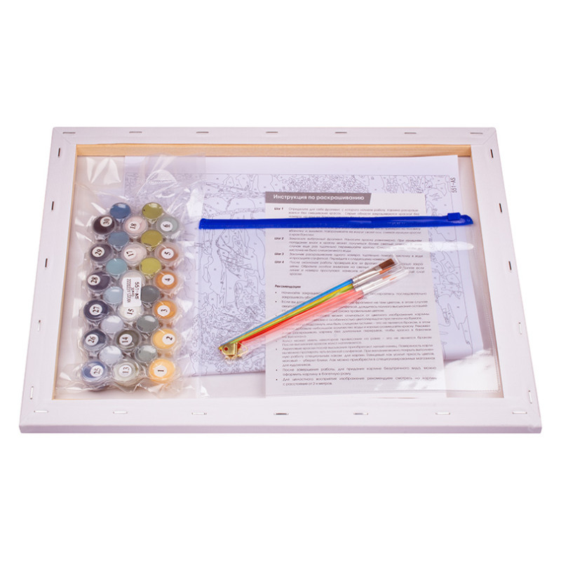 Основа картины – хлопковый холст на деревянном подрамнике с напечатанной схемой изображения. Холст загрунтован и полностью готов к нанесению краски, акриловые краски на водной основе экологически безопасны, номера на баночках соответствуют номерам на схеме. Количество красок достаточное для раскрашивания картины, даже в 2 слоя.