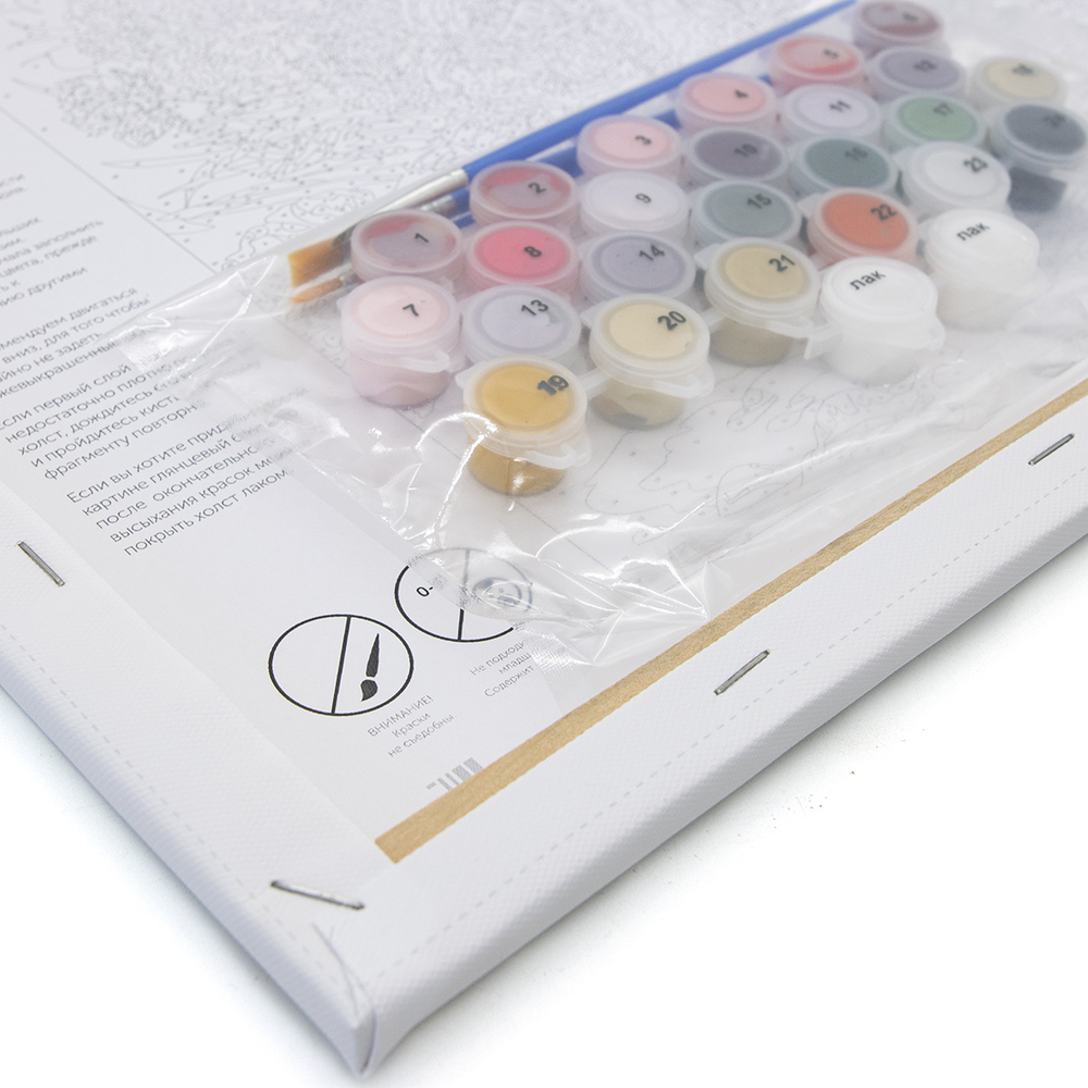 В набор входят акриловые краски – они яркие, стойкие и быстро высыхают. Краски из акрила плотные, отличаются хорошей кроющей способностью, не содержат токсичных веществ и безопасны даже для детей. Эффект настоящей живописи завершает холст с галерейной натяжкой.