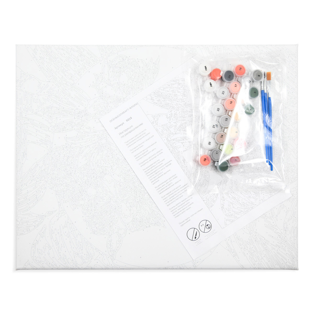 В набор входят акриловые краски – они яркие, стойкие и быстро высыхают. Краски из акрила плотные, отличаются хорошей кроющей способностью, не содержат токсичных веществ и безопасны даже для детей. Эффект настоящей живописи завершает холст с галерейной натяжкой.