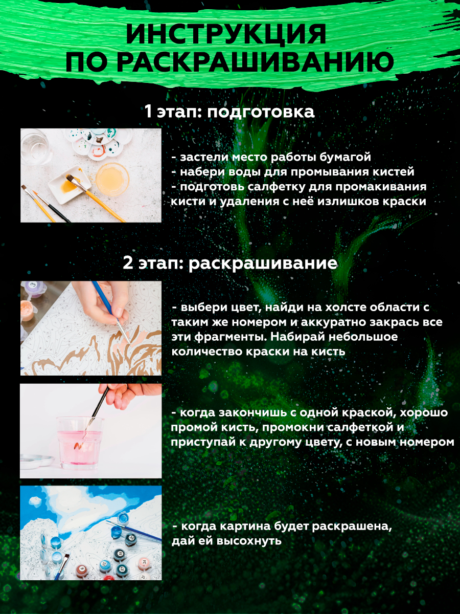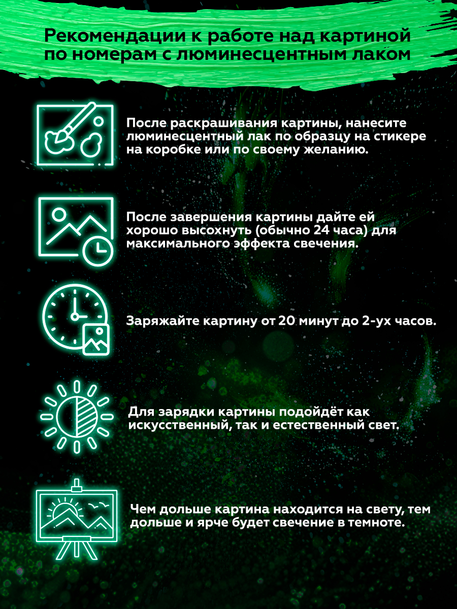 Эта уникальная картина оживит ваш интерьер, создавая эффект мерцающих звезд и загадочного сияния. Благодаря специальному люминесцентному покрытию, изображение загорается в темноте, наполняя комнату мягким светом и создавая атмосферу уюта и магии. После завершения работы рекомендуется аккуратно нанести слой прозрачного люминесцентного лака по образцу на стикере или по своему желанию. Этот лак подчеркнет яркость и сделает эффект свечения более стойким и насыщенным.