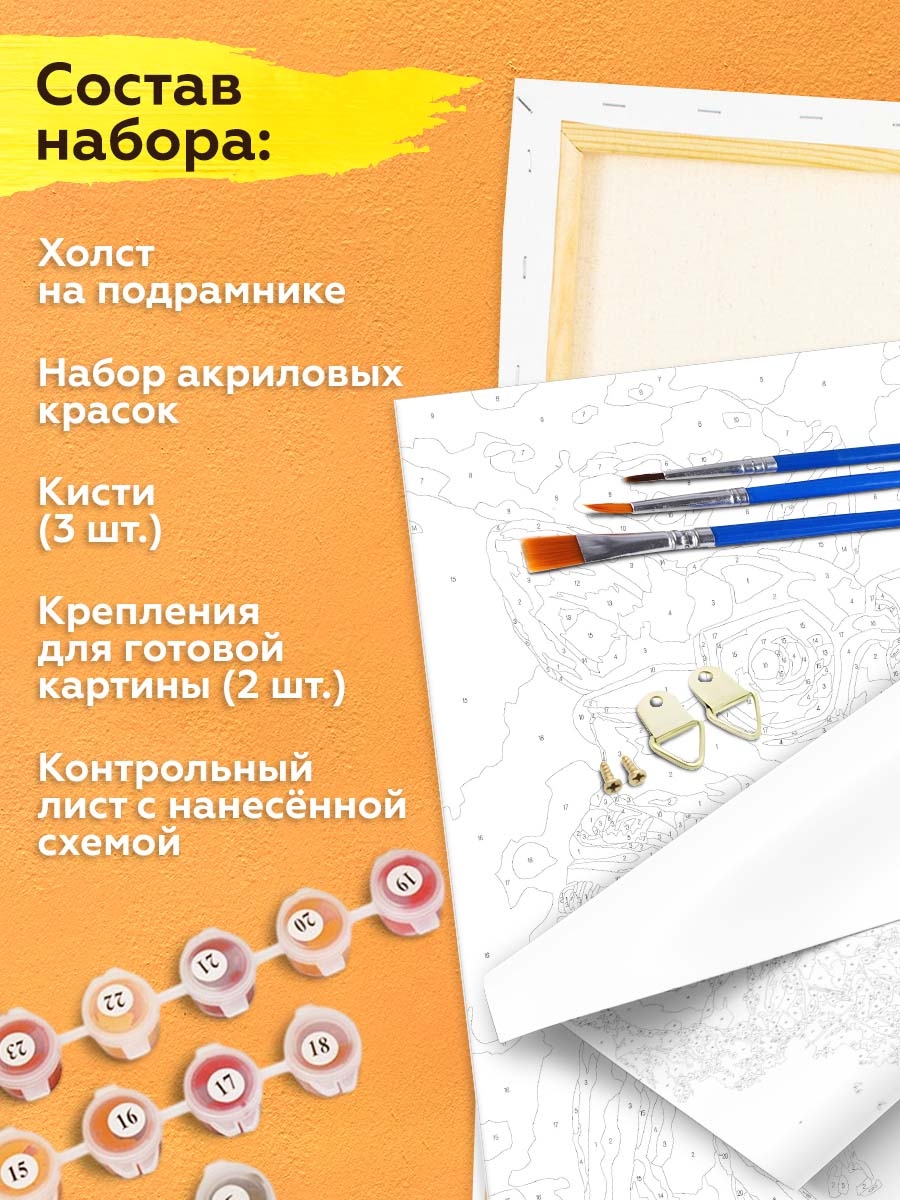 В набор входит холст с черно-белой цифровой разметкой. Каждой краске в наборе соответствует свой номер. Необходимо просто аккуратно нанести краски на участки с соответствующими цифрами. И так постепенно будет проявляться будущий шедевр.