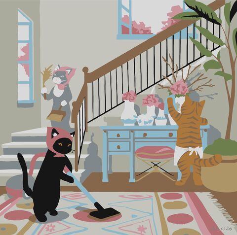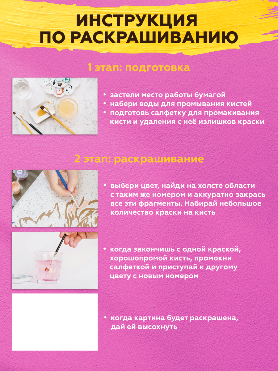 В набор входит холст с черно-белой цифровой разметкой. Каждой краске в наборе соответствует свой номер. Необходимо просто аккуратно нанести краски на участки с соответствующими цифрами. И так постепенно будет проявляться будущий шедевр.