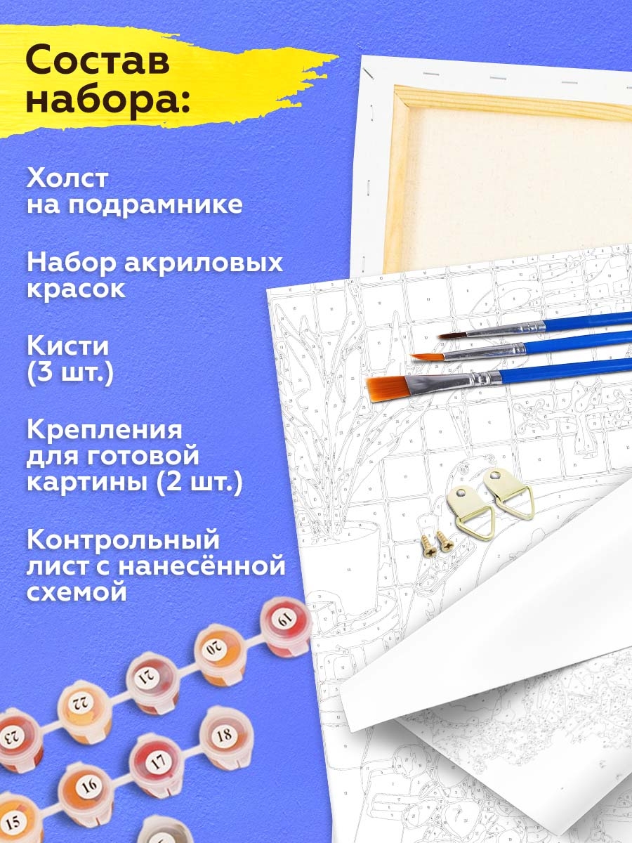 В набор входит холст с черно-белой цифровой разметкой. Каждой краске в наборе соответствует свой номер. Необходимо просто аккуратно нанести краски на участки с соответствующими цифрами. И так постепенно будет проявляться будущий шедевр.
