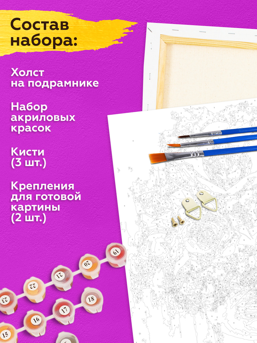 В набор входит холст с черно-белой цифровой разметкой. Каждой краске в наборе соответствует свой номер. Необходимо просто аккуратно нанести краски на участки с соответствующими цифрами. И так постепенно будет проявляться будущий шедевр.