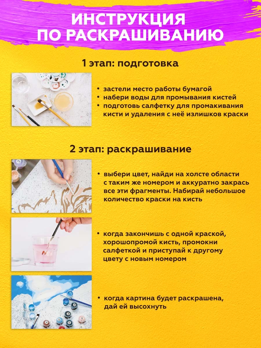 В комплект входят акриловые краски, отличающиеся яркостью и стойкостью. Они быстро сохнут, обеспечивают плотное покрытие и позволяют добиться насыщенных оттенков. Акриловые краски безопасны, так как не содержат токсичных веществ. Завершает картину галерейная натяжка холста, которая придаёт ей профессиональный вид.