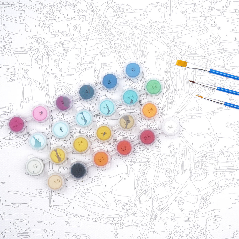 В комплект входят акриловые краски, отличающиеся яркостью и стойкостью. Они быстро сохнут, обеспечивают плотное покрытие и позволяют добиться насыщенных оттенков. Акриловые краски безопасны, так как не содержат токсичных веществ. Три вида кистей позволят проработать как крупные участки изображения, так и мелкие детали, требующие особой аккуратности.