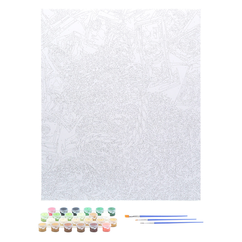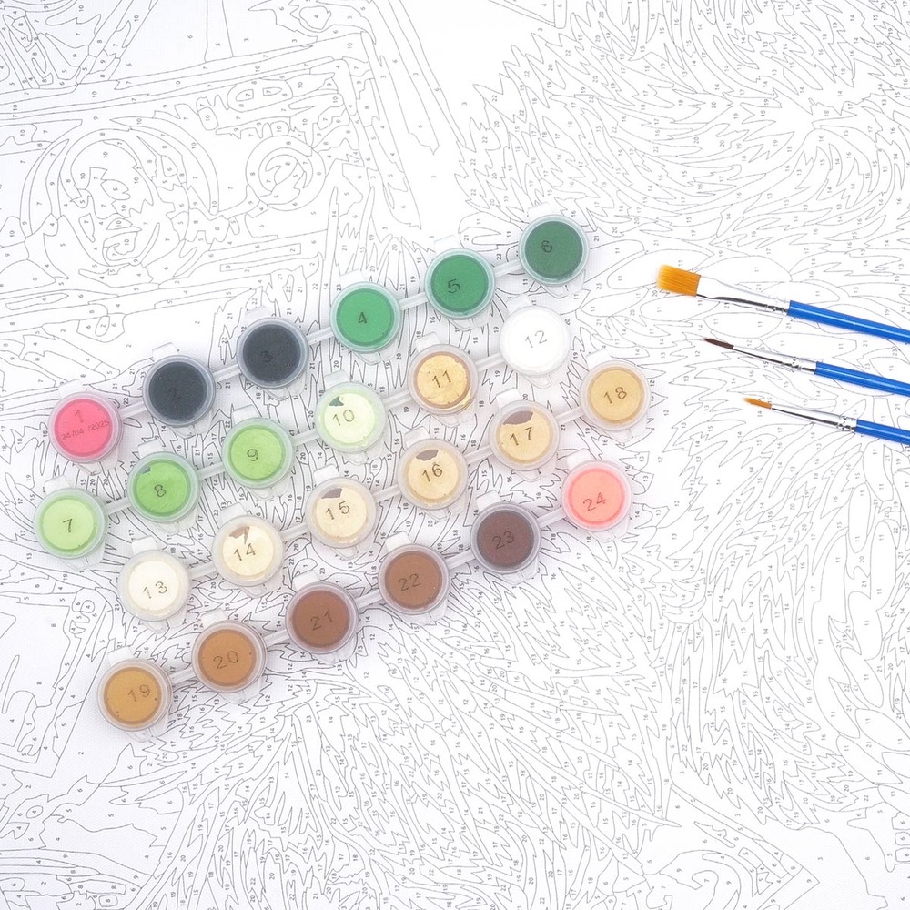 В комплект входят акриловые краски, отличающиеся яркостью и стойкостью. Они быстро сохнут, обеспечивают плотное покрытие и позволяют добиться насыщенных оттенков. Акриловые краски безопасны, так как не содержат токсичных веществ. Три вида кистей позволят проработать как крупные участки изображения, так и мелкие детали, требующие особой аккуратности.