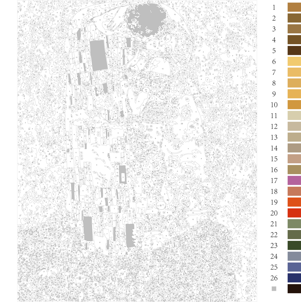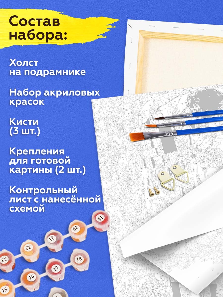 В набор входит холст с черно-белой цифровой разметкой. Каждой краске в наборе соответствует свой номер. Необходимо просто аккуратно нанести краски на участки с соответствующими цифрами. И так постепенно будет проявляться будущий шедевр.