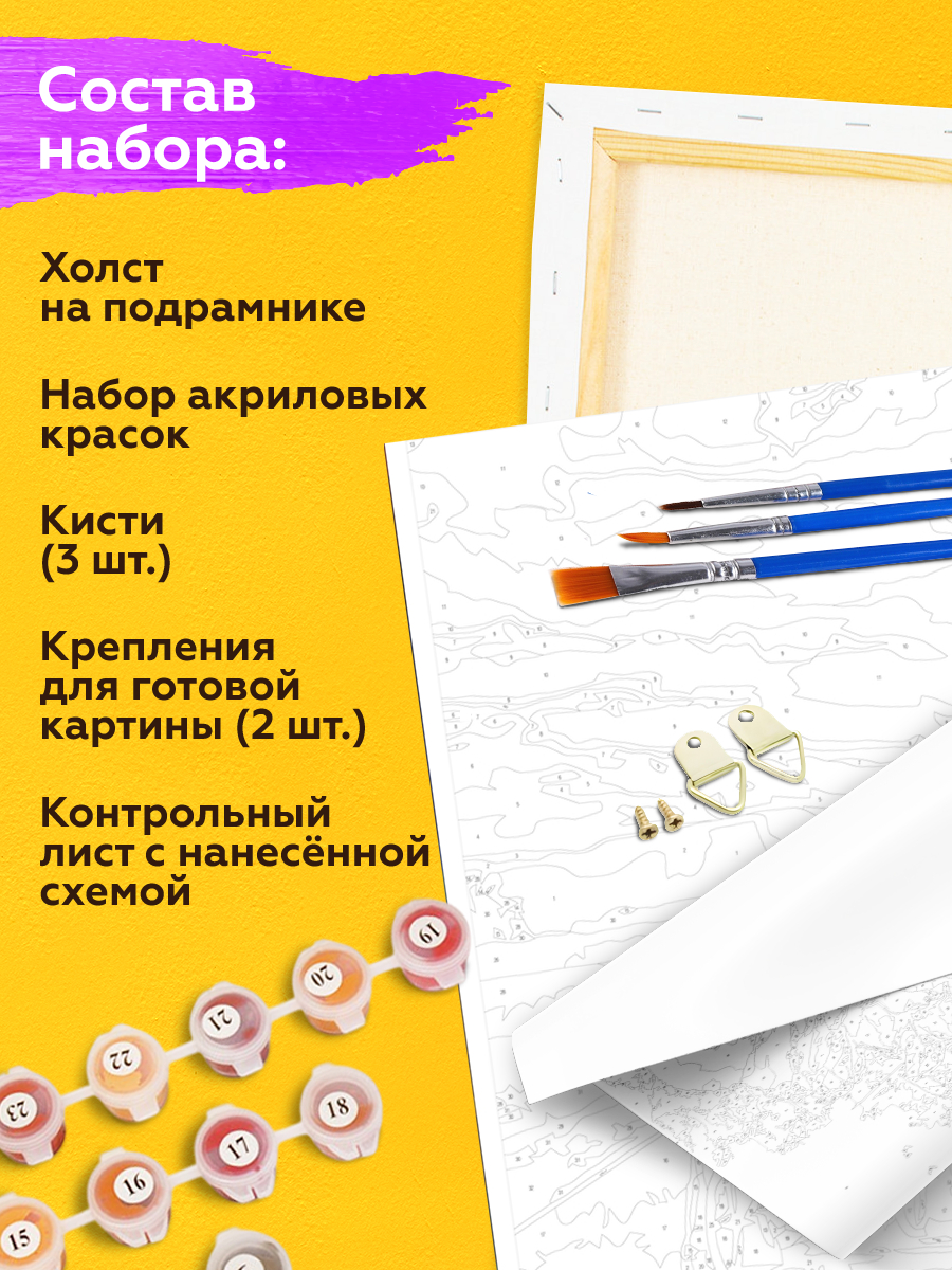 В набор входит холст с черно-белой цифровой разметкой. Каждой краске в наборе соответствует свой номер. Необходимо просто аккуратно нанести краски на участки с соответствующими цифрами. И так постепенно будет проявляться будущий шедевр.