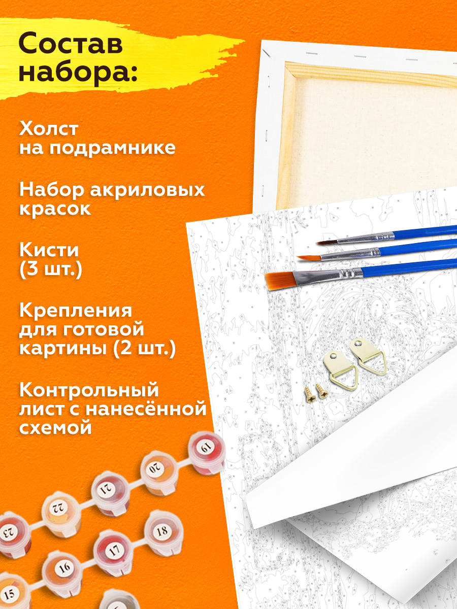 В набор входит холст с черно-белой цифровой разметкой. Каждой краске в наборе соответствует свой номер. Необходимо просто аккуратно нанести краски на участки с соответствующими цифрами. И так постепенно будет проявляться будущий шедевр.