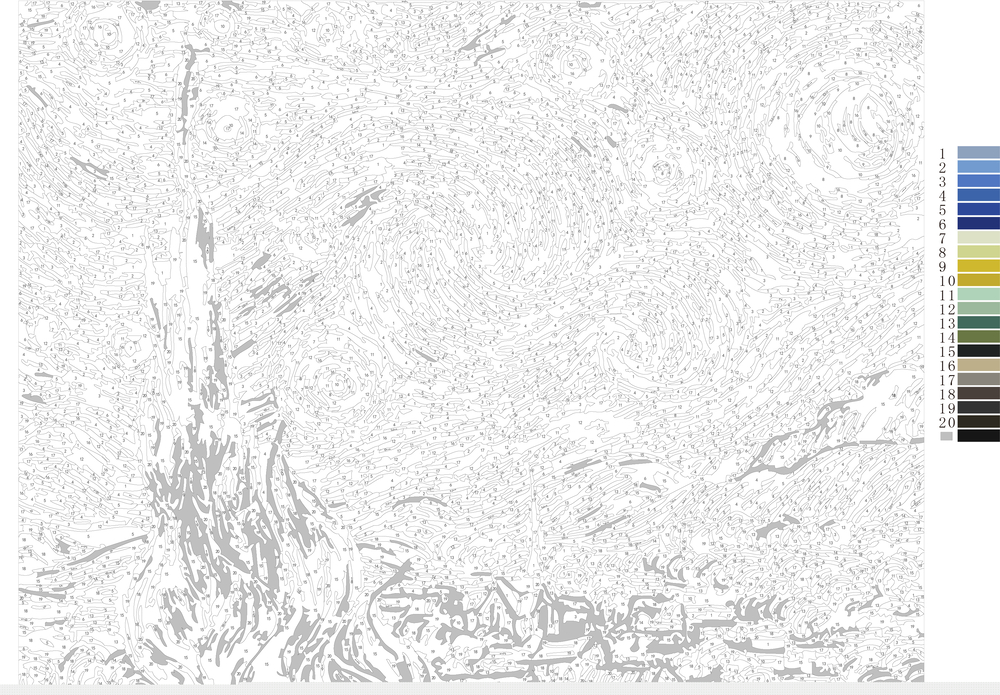 В набор входит холст с черно-белой цифровой разметкой. Каждой краске в наборе соответствует свой номер. Необходимо просто аккуратно нанести краски на участки с соответствующими цифрами. И так постепенно будет проявляться будущий шедевр.