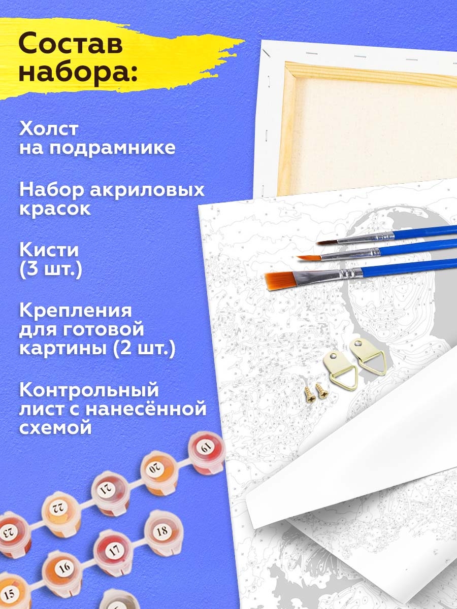 В набор входит холст с черно-белой цифровой разметкой. Каждой краске в наборе соответствует свой номер. Необходимо просто аккуратно нанести краски на участки с соответствующими цифрами. И так постепенно будет проявляться будущий шедевр.