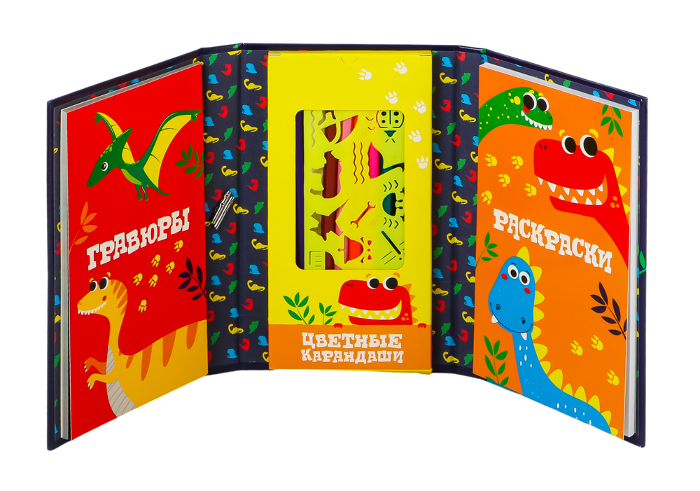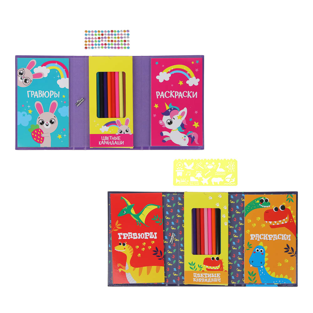 Включает 30 раскрасок, 10 гравюр, 8 цветных карандашей, штихель и стразы либо трафарет в зависимости от типа комплекта.