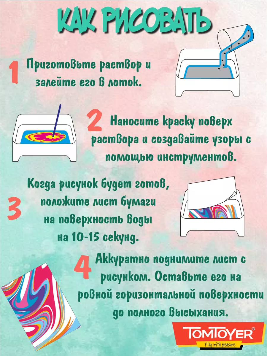 Для начала необходимо осуществить приготовления из инструкции, входящей в набор. Теперь, когда всё готово к процессу творчества, можно приступать к рисованию на воде. Отправьте несколько капель пигмента в воду и начните медленно скользить по краске с помощью соломинки или гребня, создавая причудливые узоры. Продолжайте до тех пор, пока не будете удовлетворены получившимся изображением. Теперь его можно перенести на бумагу. Осторожно приложите лист к поверхности жидкости на 10-15 секунд. Аккуратно достаньте и высушите листок в горизонтальном положении.