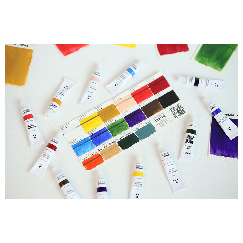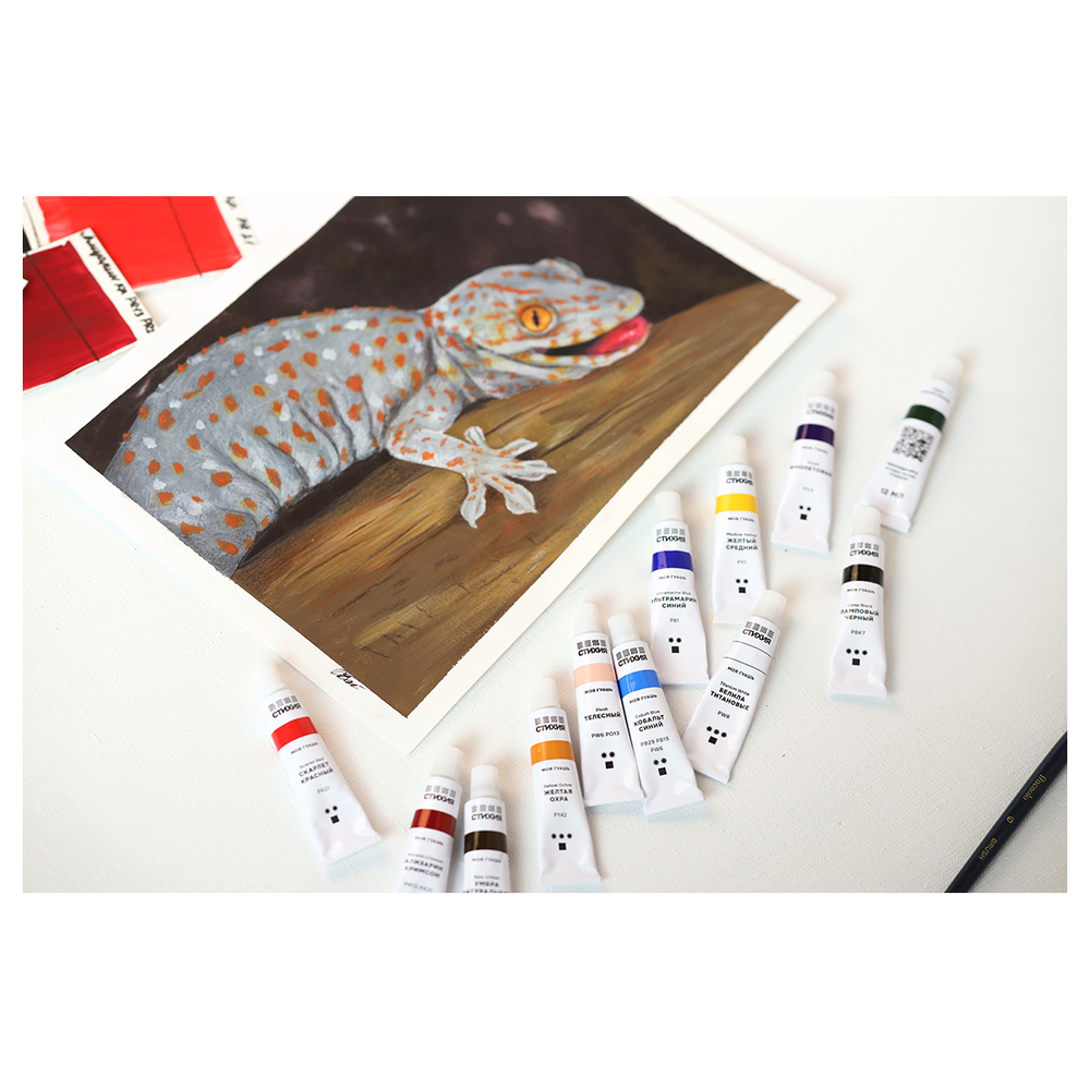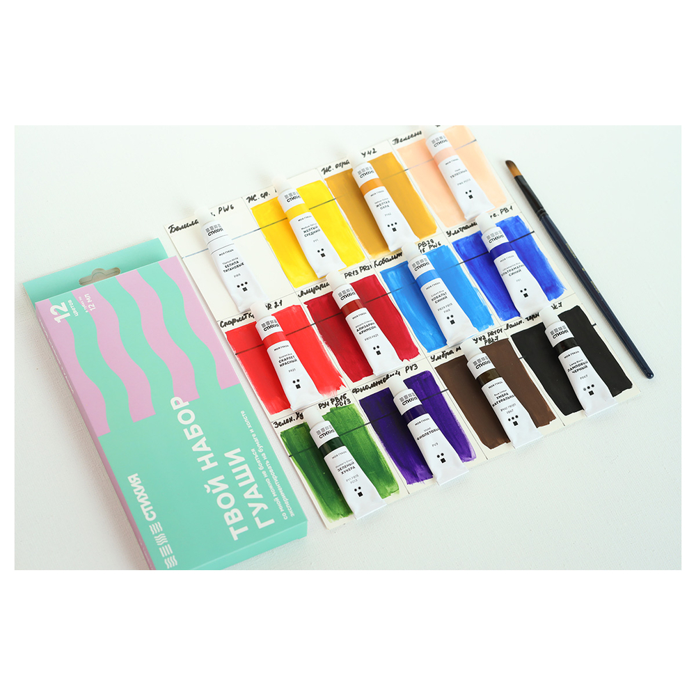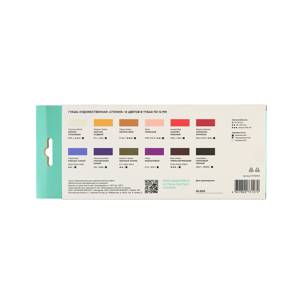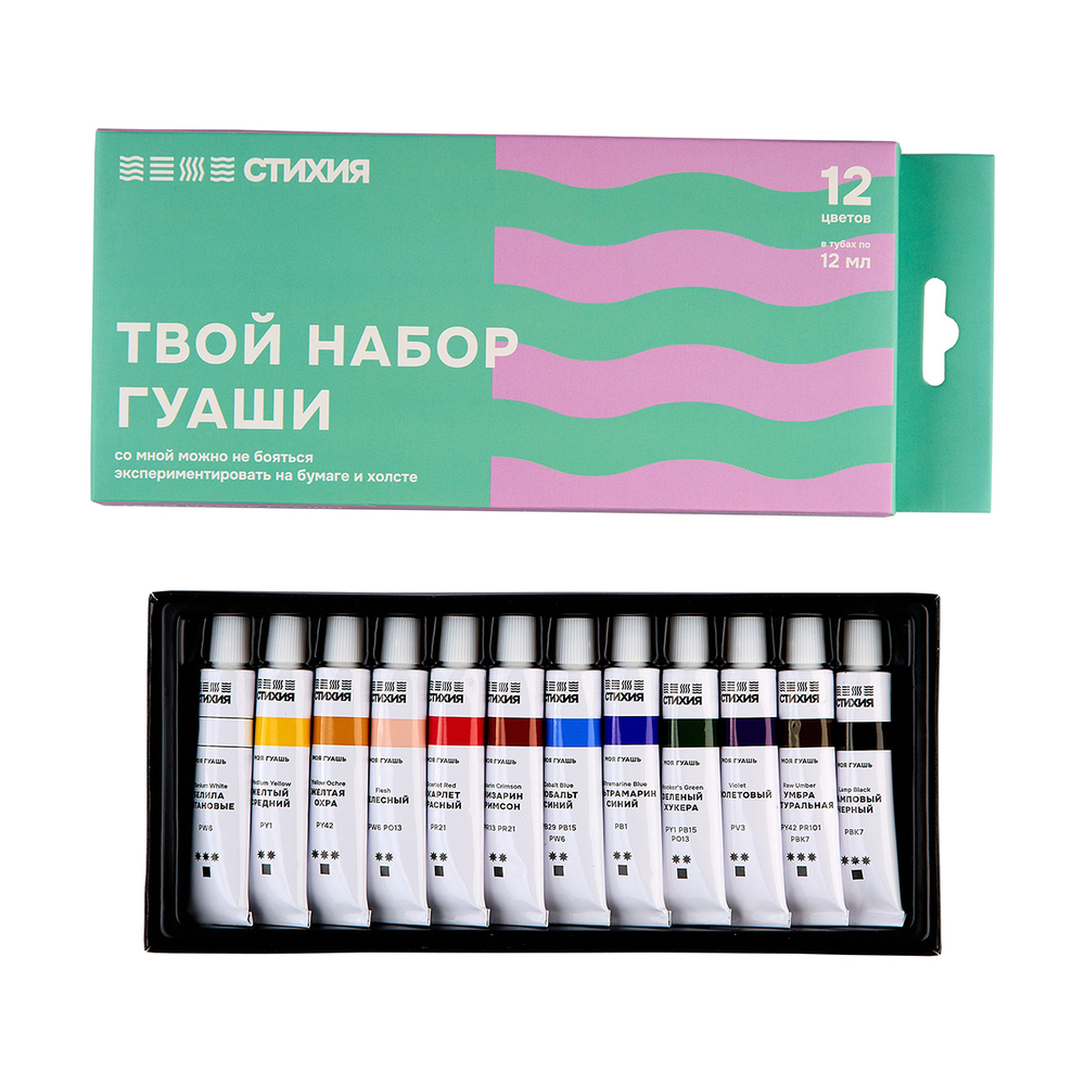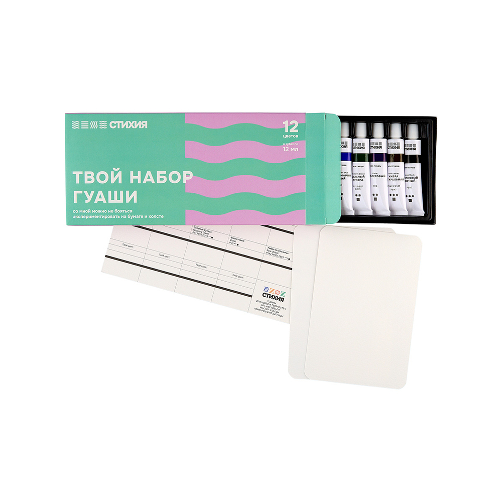 Гуашь "Стихия" для рисования и дизайнерских работ. Укрывистые насыщенные цвета. Светостойкие пигменты. В комплекте лист для выкрасок.