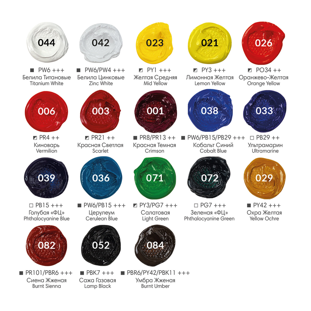 Краска имеет 5 степеней затирки пигмента. Вязкая текстура краски обеспечивает сохранение ее эластичности в течение длительного времени. Все краски легко смешиваются между собой. Объем тубы – 12 мл.