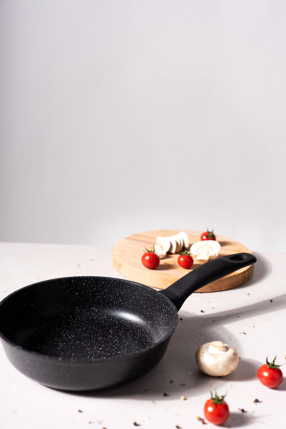 Сковорода изготовлена из высококачественного литого алюминия, что обеспечивает равномерное распределение тепла и предотвращает пригорание пищи.