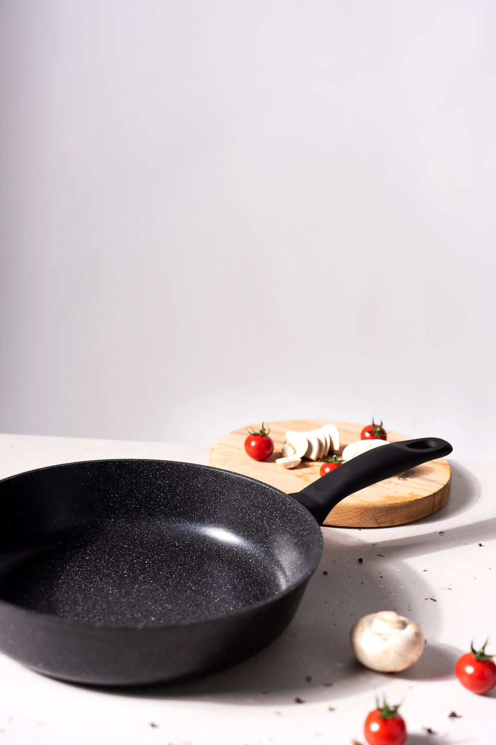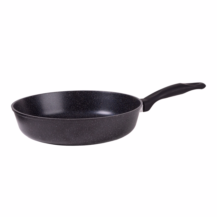 Сковорода изготовлена из высококачественного литого алюминия, что обеспечивает равномерное распределение тепла и предотвращает пригорание пищи.