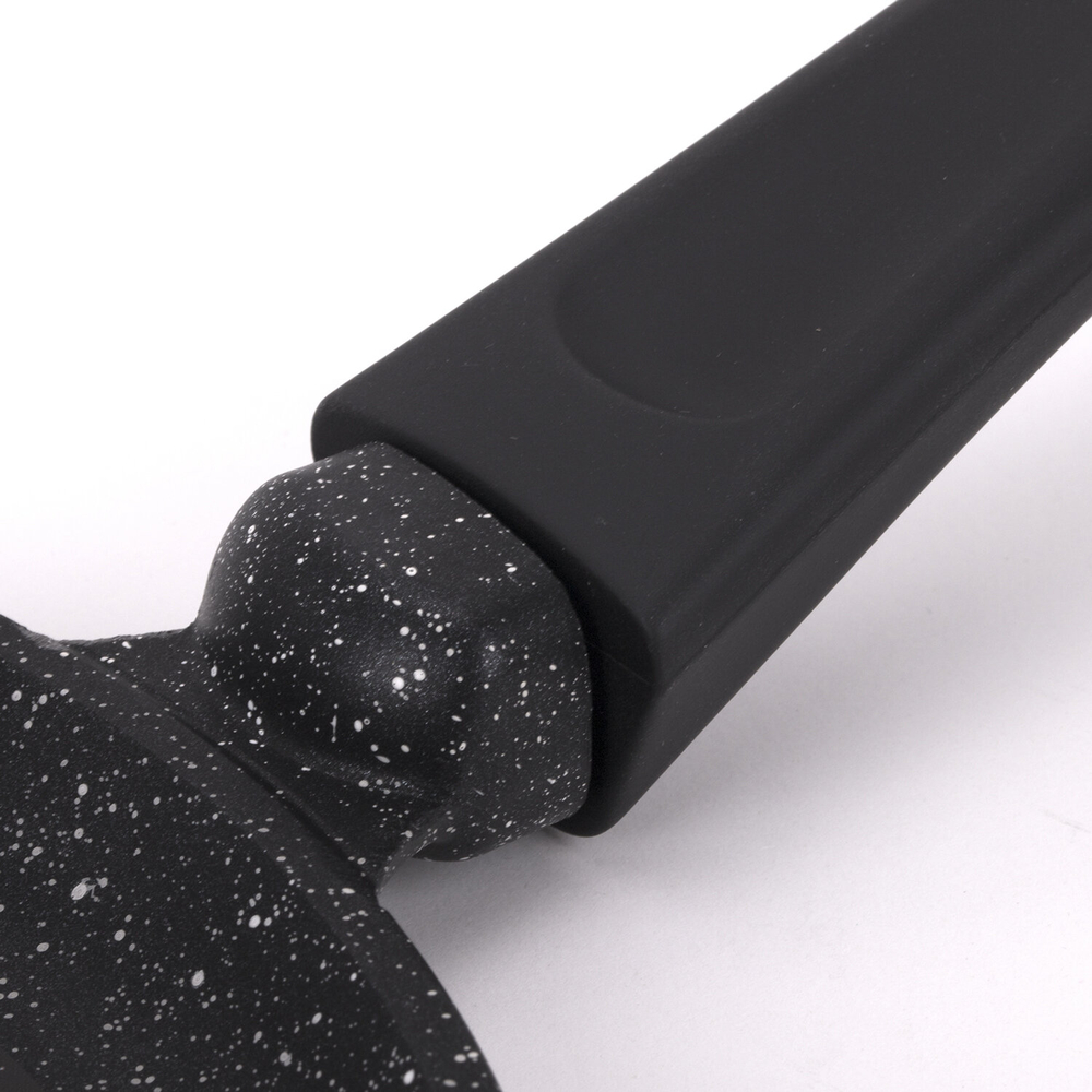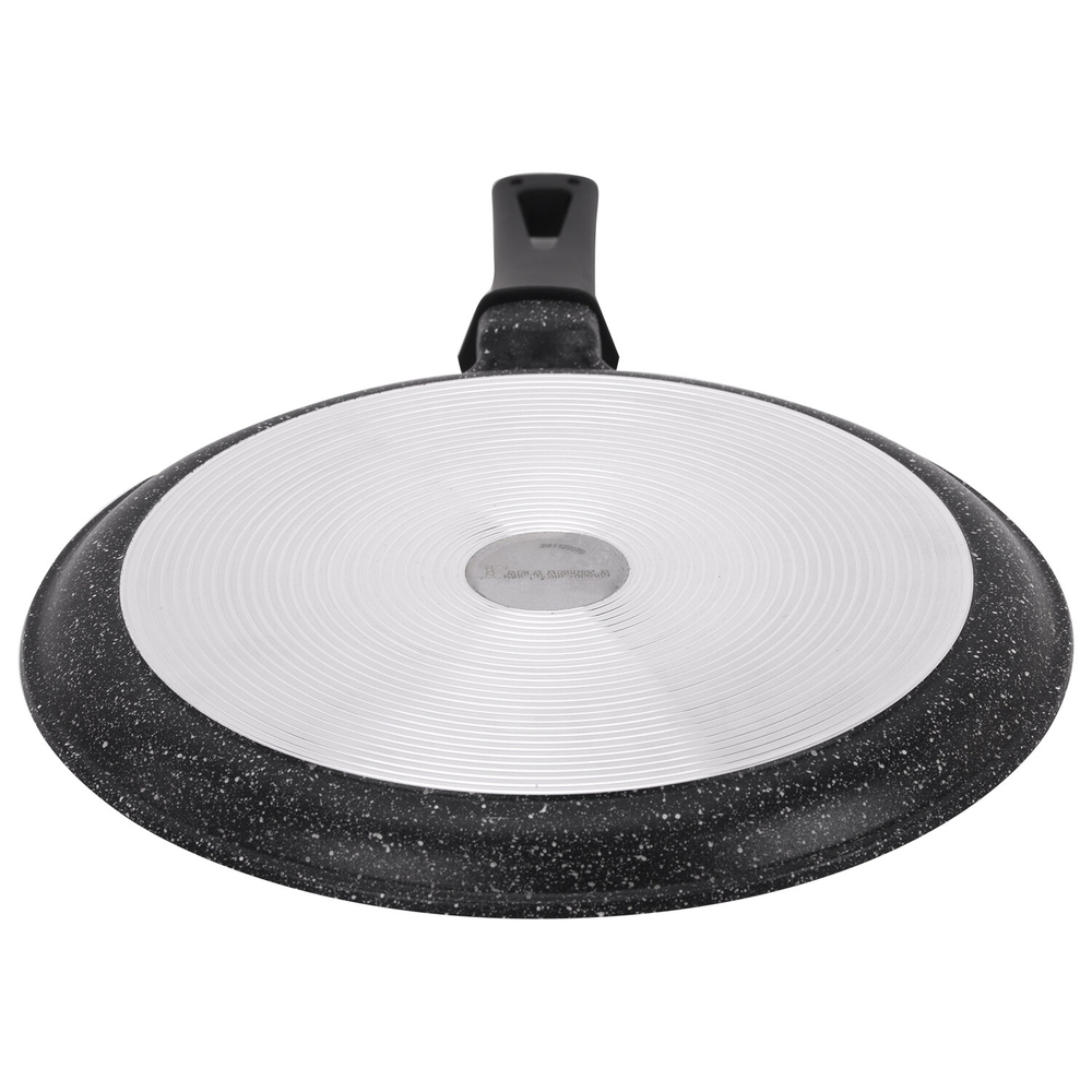 Массивное дно (4,5 мм) и стенки (3,5 мм) не подвержены деформации, царапинам и сколам. Диаметр сковороды – 24 см.