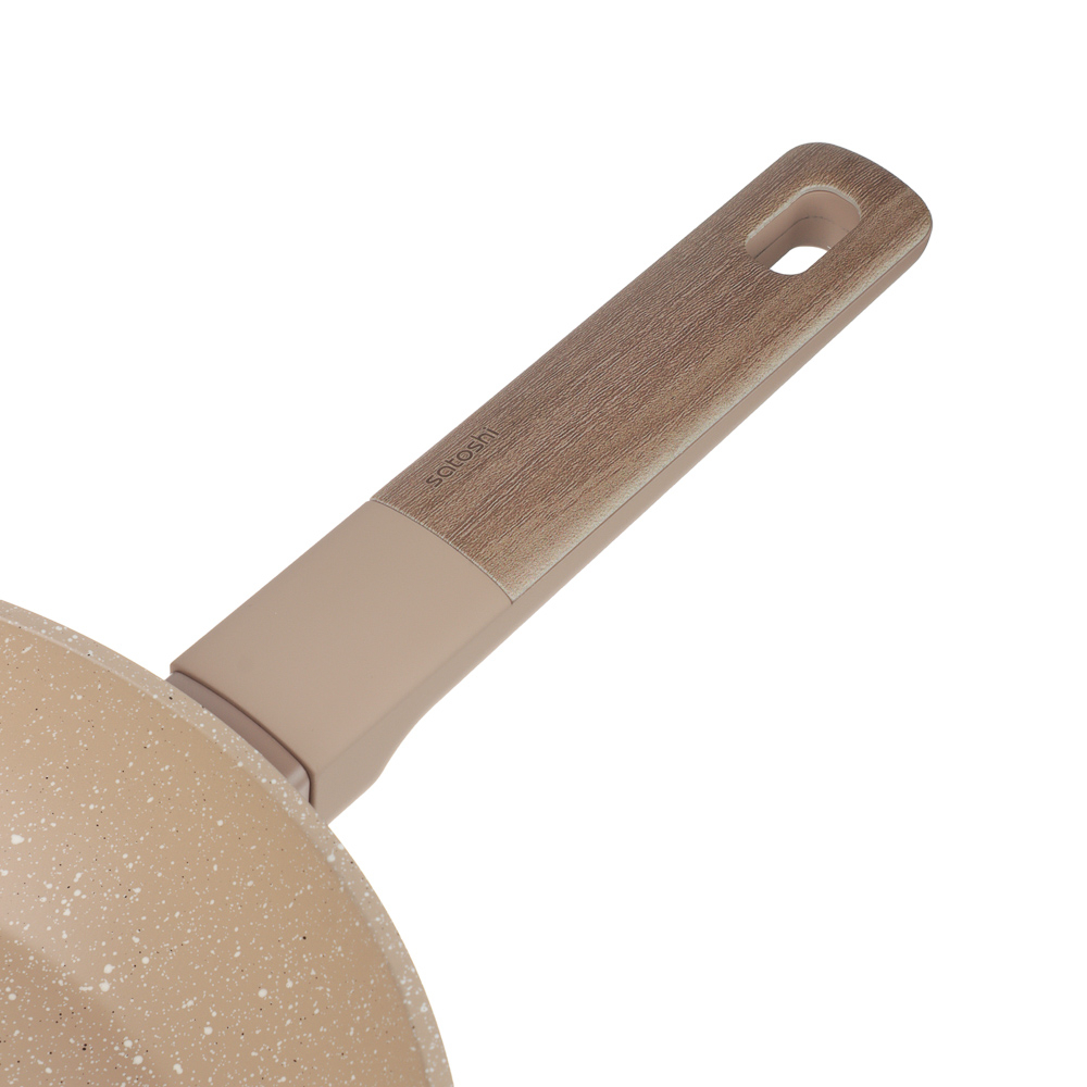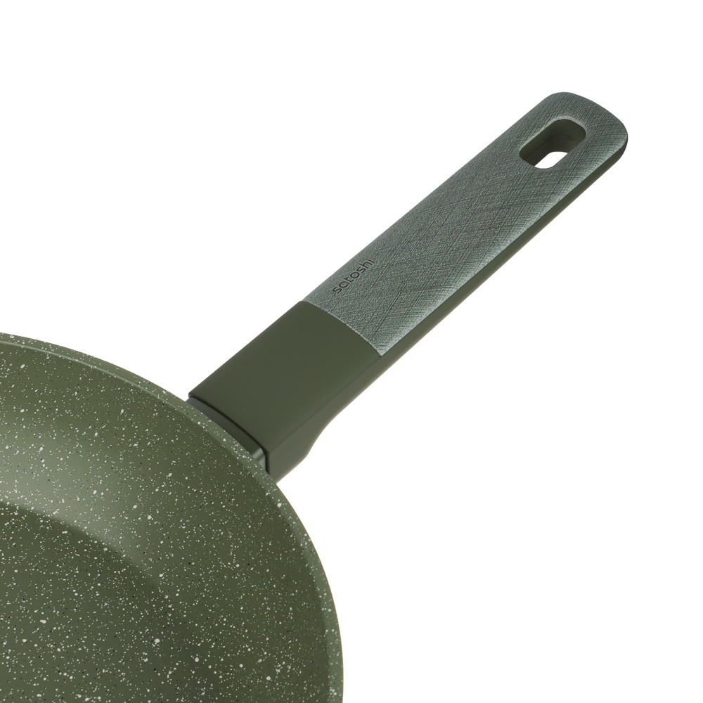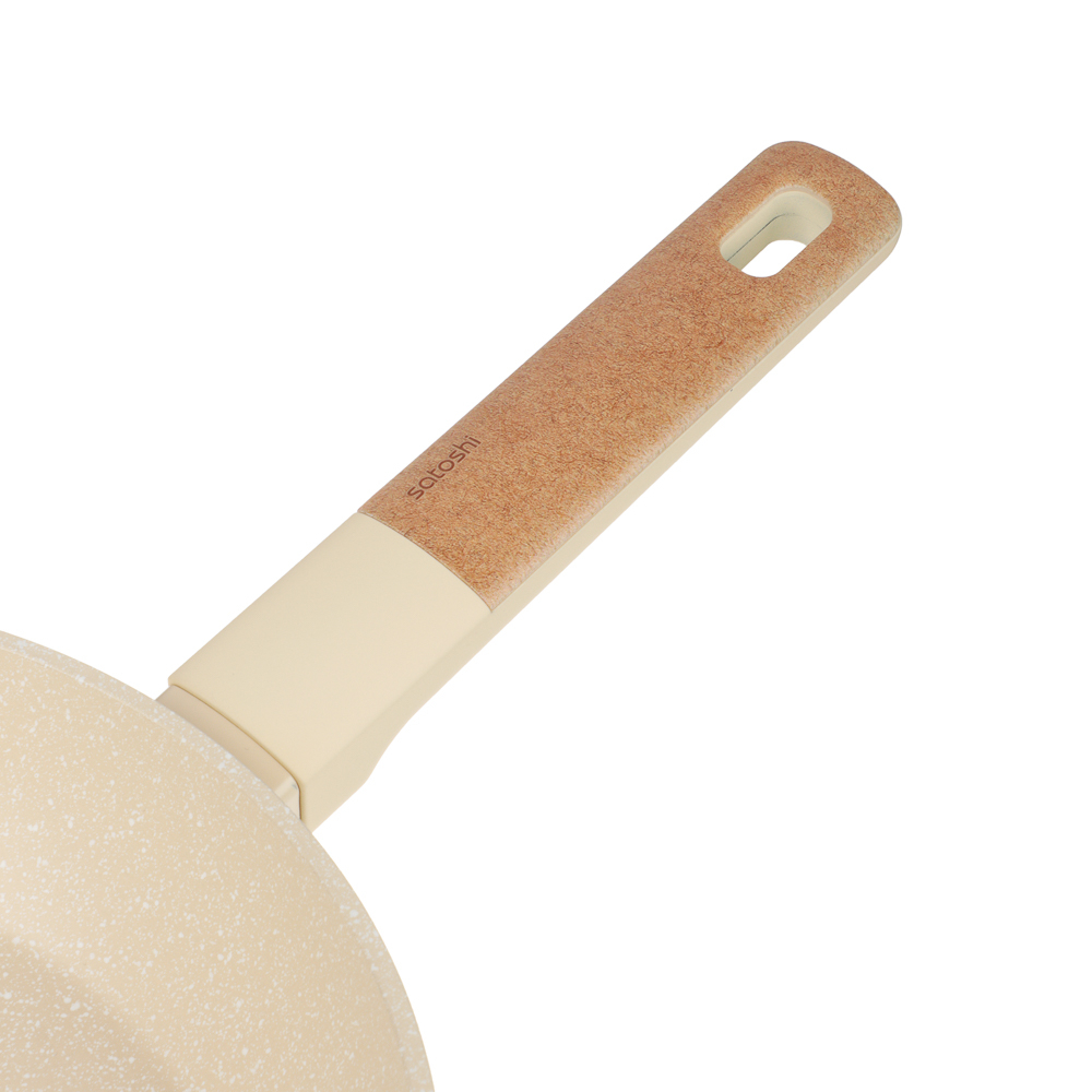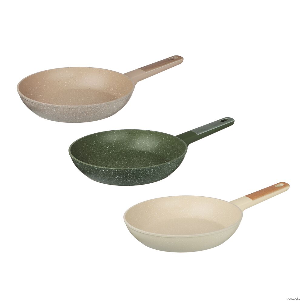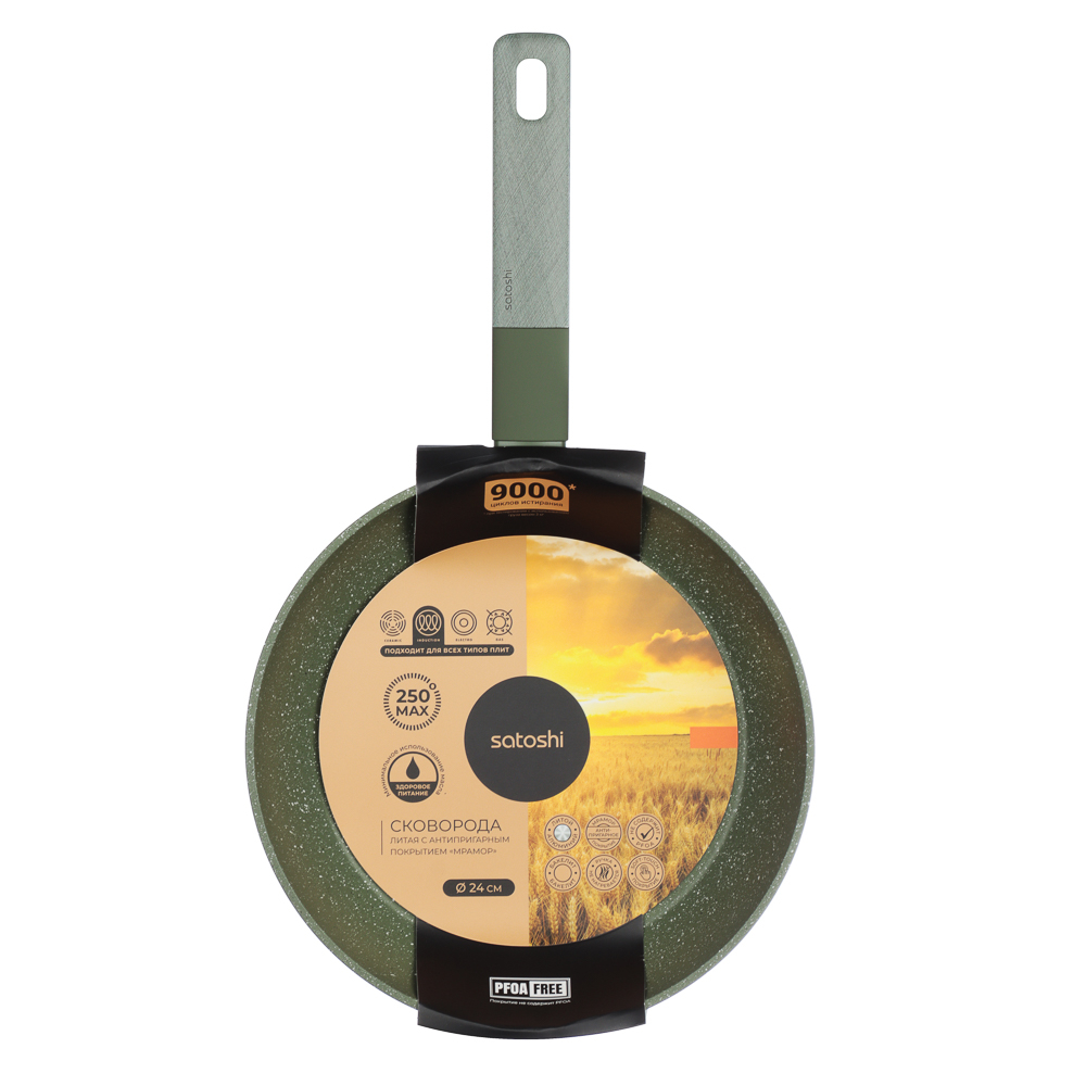 Сковорода подходит для всех типов плит, включая индукцию, и выдерживает нагрев до 250°C. Бакелитовая ручка с покрытием софт-тач не нагревается во время готовки и удобно лежит в руке. А ещё сковороду можно мыть в посудомоечной машине – это сэкономит ваше время после трапезы.