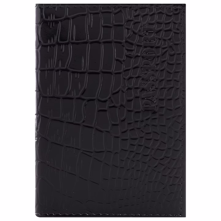 Модель выполнена из натуральной кожи с отделкой под кожу крокодила черного цвета, что подчеркнет стиль и изысканный вкус обладателя. Украшена тисненой надписью "Passport", края прострочены. На внутреннем развороте расположены два кармана из прозрачного пластика.