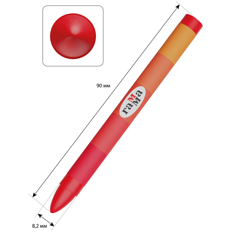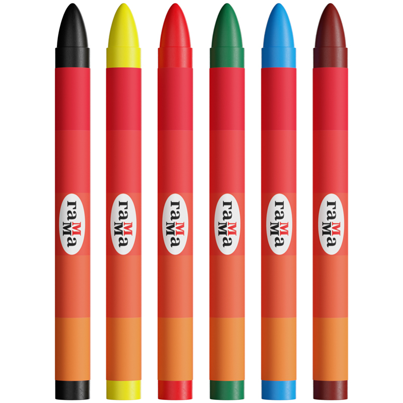 Мелки имеют круглую форму, длина мелка составляет 90 мм, а диаметр корпуса – 8 мм. В наборе 6 ярких цветов: жёлтый, зелёный, синий, красный, чёрный, коричневый. Они идеальны для первых начинаний ребенка в рисовании и раскрашивании, так как они удобно лежат в руке.
