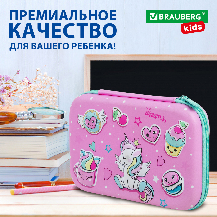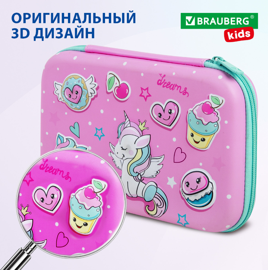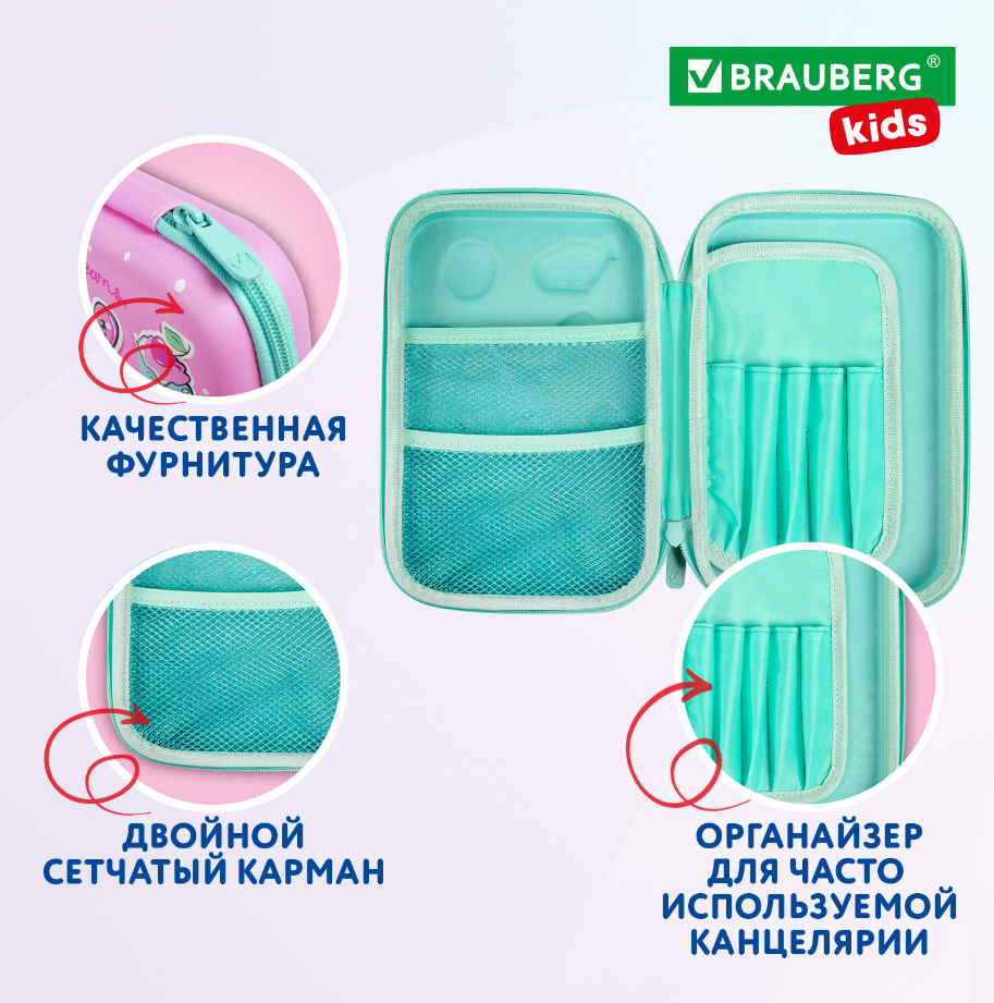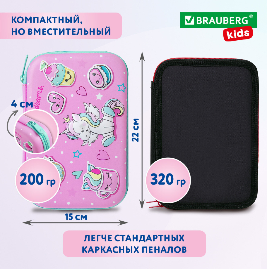 Пеналы BRAUBERG KIDS большого размера удобно брать с собой в школу и на внешкольные занятия, а также использовать дома. Особенность материала EVA делает сам пенал легким и компактным, удобным для переноски в ранце, рюкзаке или сумке.