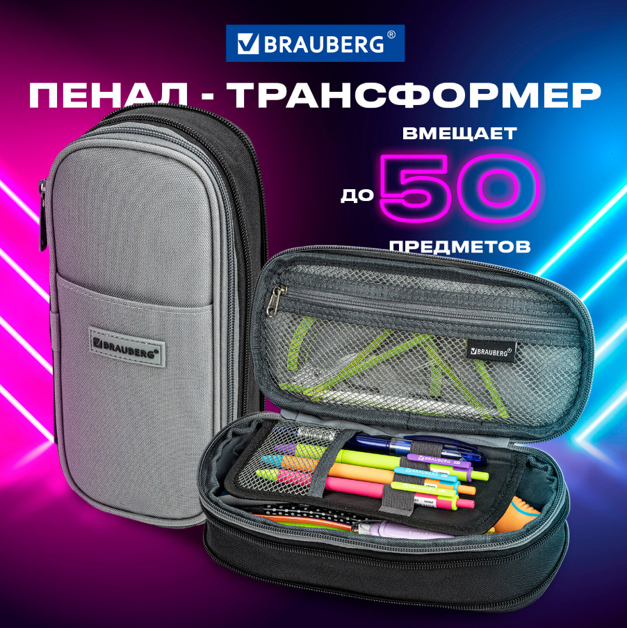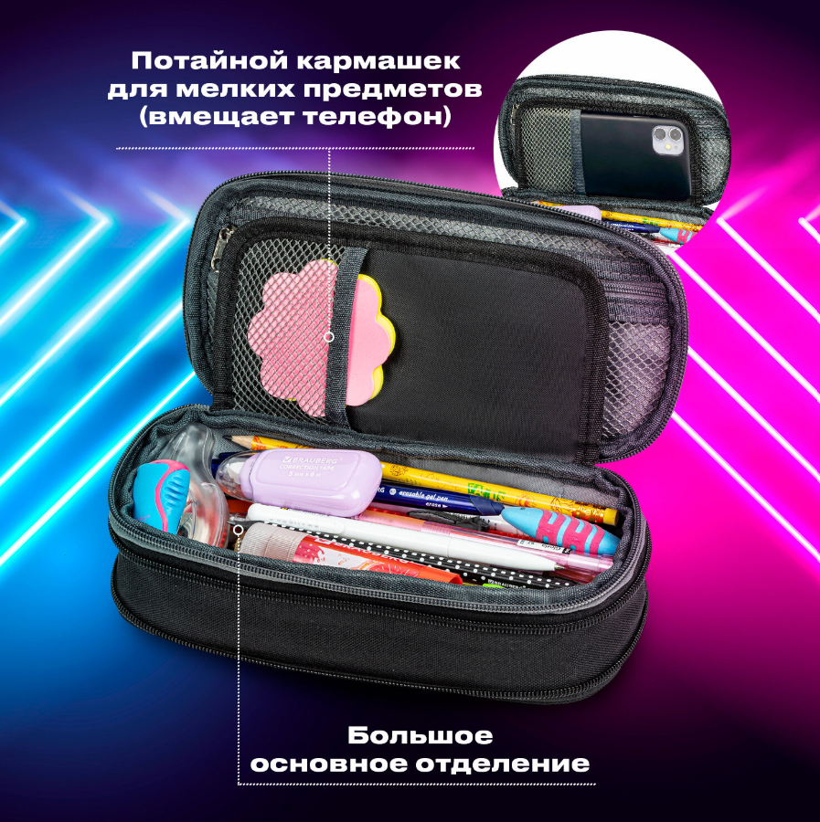 Пенал-трансформер вместительного размера 22х10 см, с возможностью трансформировать объем с 3 см до 6,5 см при помощи двойной застежки-молнии снаружи.