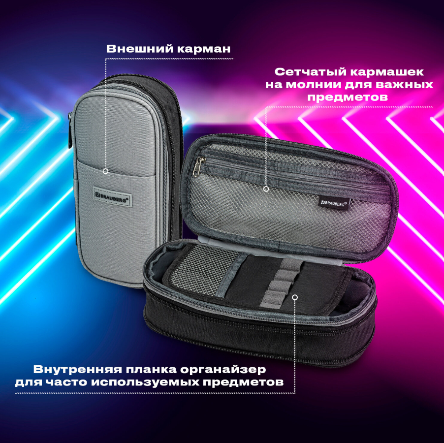 Пенал имеет одно вместительное отделение, оснащен внешним карманом без застежки, дополнительным сетчатым карманом на молнии и откидной планкой с органайзером внутри.