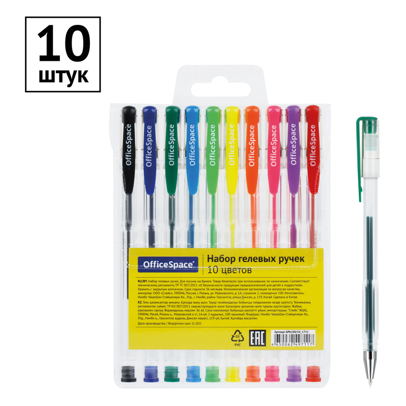 Набор гелевых ручек включает 10 цветов.