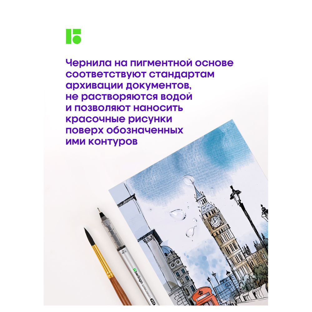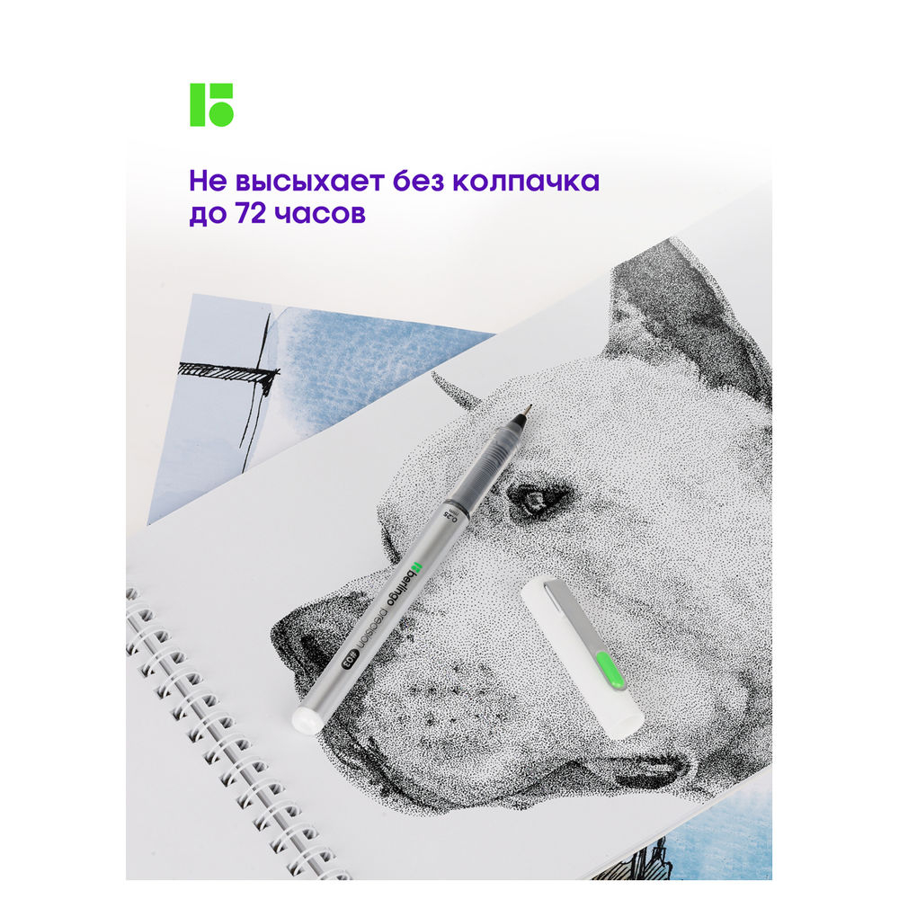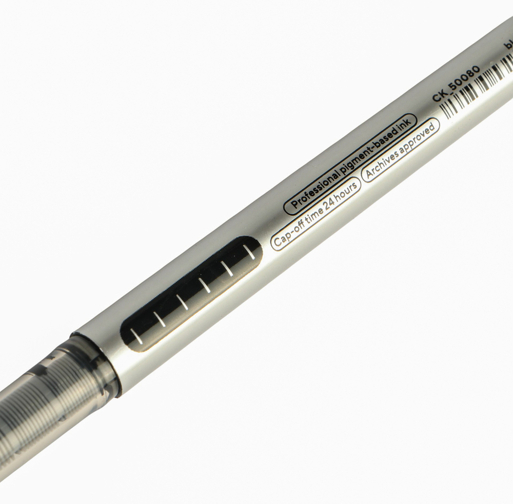 Профессиональный пишущий узел не только обеспечивает толщину линии с шагом 0,05 мм, но и позволяет ручке продолжить писать, даже если забыть закрыть ее колпачком на срок до 72 часов. Удобное окошко на обороте ручке позволит контролировать остаток чернил и заранее подготовить новый инструмент. А металлический клип – надежно закрепить ручку на скетчбуке, планшете или кармане.