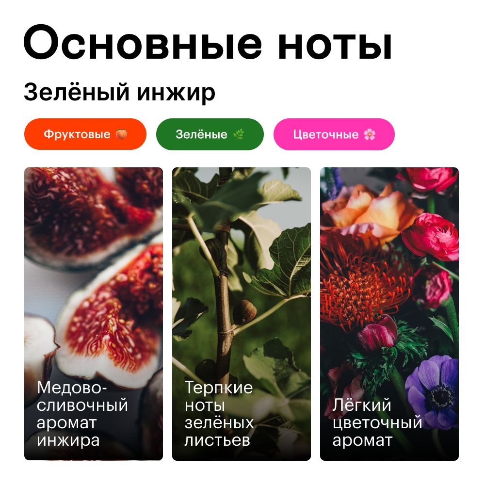 Моно-аромат не имеет классического деления на "верхние", "средние" и "базовые" ноты. Через 2 часа аромат будет раскрываться точно так же, как после первого "пшика". Поэтому ароматы бренда так легко выбирать и сочетать между собой!
