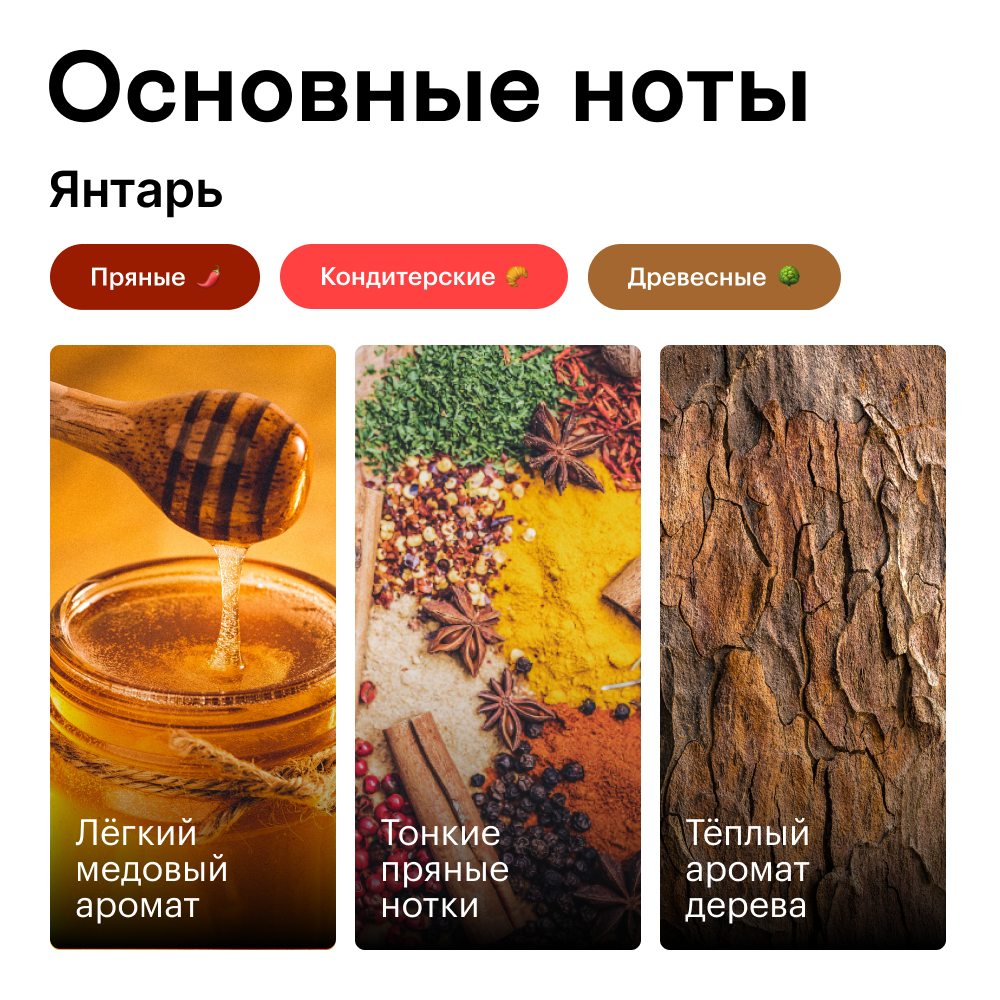 Духи с ароматом янтаря – это тёплый, лёгкий медовый аромат с лёгкими пряными нотками. Кстати, если вы решили всё-таки найти исчезнувшую Янтарную комнату – отправляйтесь в Калининград, там есть музей янтаря, или в Большой Екатерининский Дворец (под Петербургом), там эту комнату воссоздали в первозданном виде. Но знайте, аромат "Amber" – это уже находка.