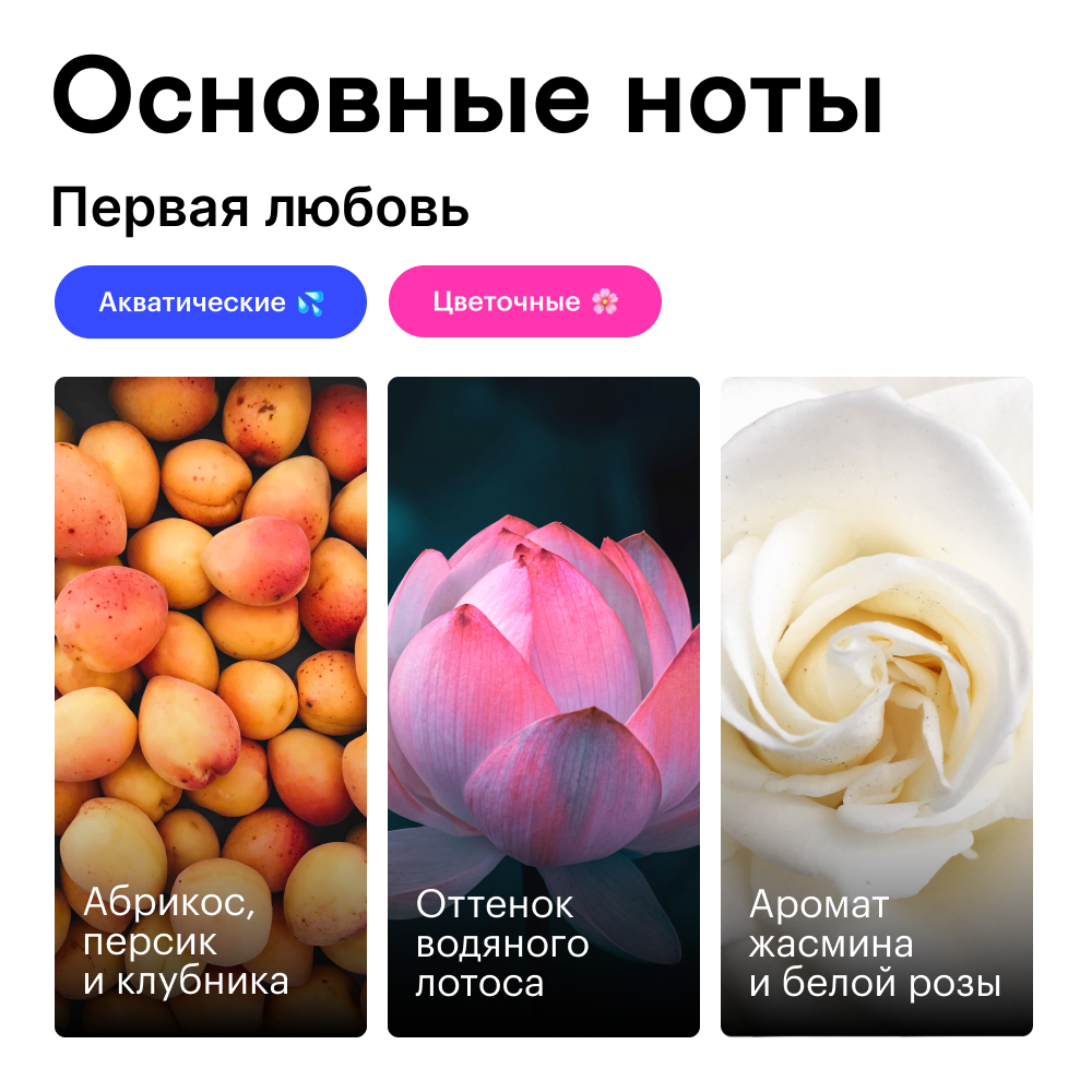 В качестве стартовых искрящихся нот использованы необычные ароматы – цветы абрикоса, кожица персика и соцветия клубники – не совсем стандартные фруктовые ноты. В центре этого аромата вы можете почувствовать освежающие ноты жимолости, характерный азиатский оттенок водяного лотоса, насыщенные ароматы жасмина и белой розы.