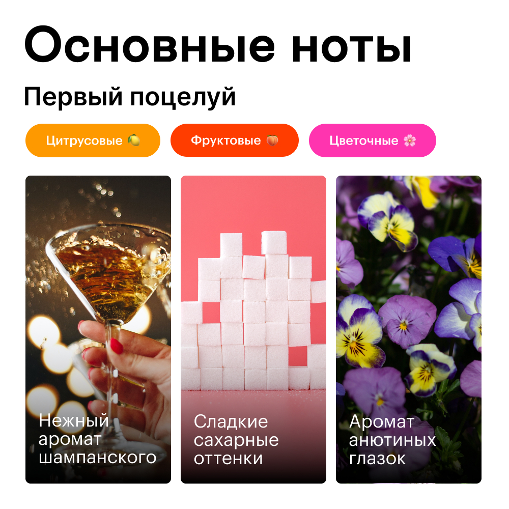 Помните свой первый поцелуй? Это один из самых приятных и волнительных моментов в жизни каждого человека. В аромате, вдохновленном первым поцелуем, соединились все самые теплые и добрые воспоминания. Вечерний киносеанс в полупустом зале, летняя прогулка под дождем или школьная дискотека... Осторожно, вызывает мурашки и бабочек в животе!